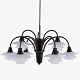 PH 1/1 - 'Bombardement'-lysekrone med 9 arme i bruneret messing og skærme i mat glas. Stemplet 'Patented'.