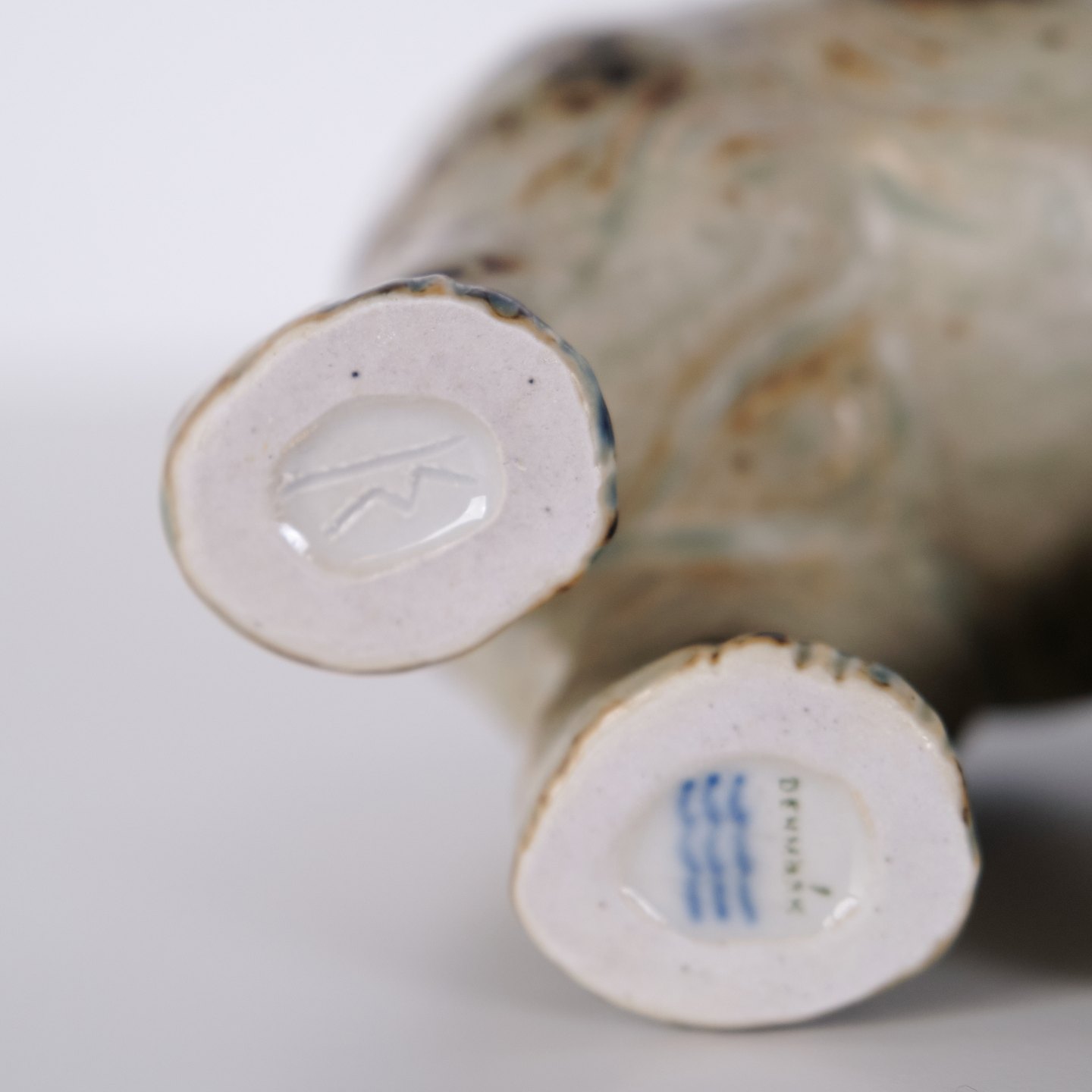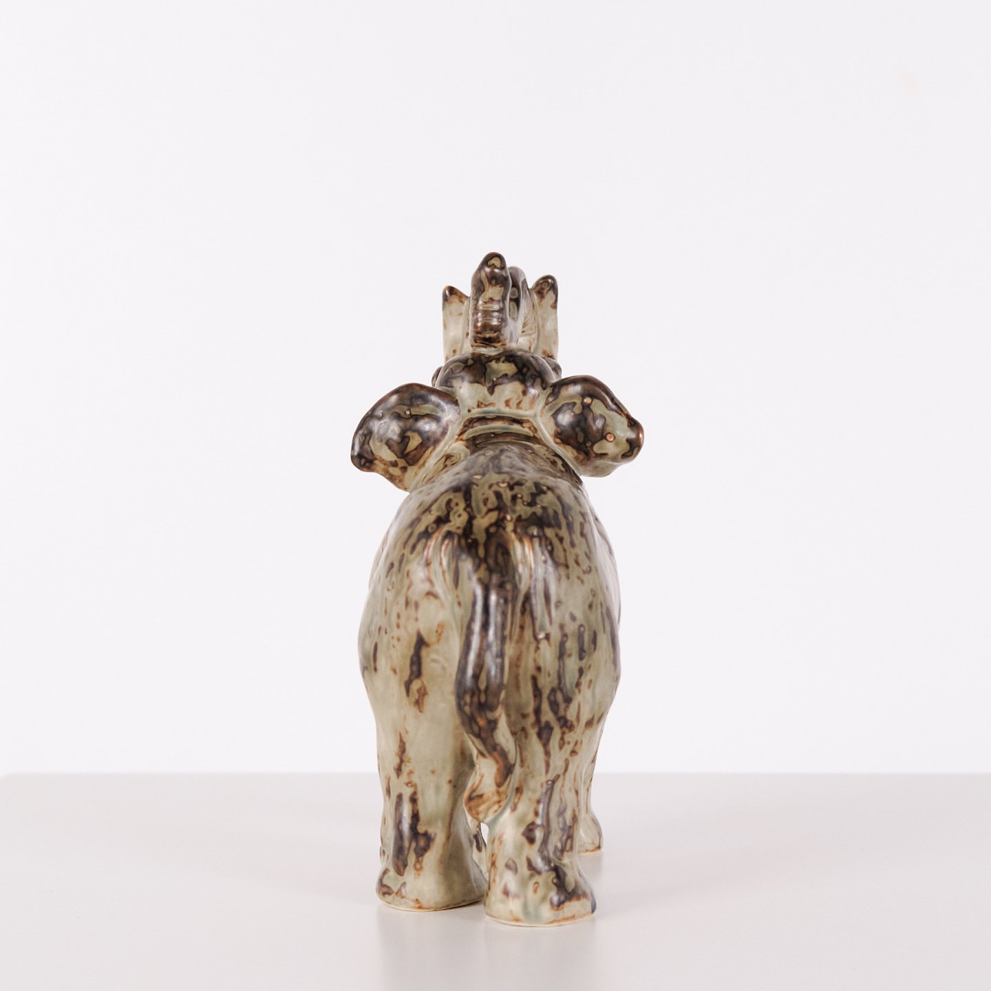 Beskrivelse: Stentøjsfigur af elefant, model 21517, designet af Knud Kyhn for Royal Copenhagen. Figuren er fremstillet i stentøj, mærket med Kyhns signatur (KK), tre bølgelinjer og modelnummeret. Kyhn arbejdede for Royal Copenhagen med dyrefigurer især i 1950’erne og 1960’erne, hvor hans motiver blev produceret i første sortering og er eftertragtede i samlermiljøer. Figuren repræsenterer dansk stentøjskunst med fokus på dyreform og proportioner.