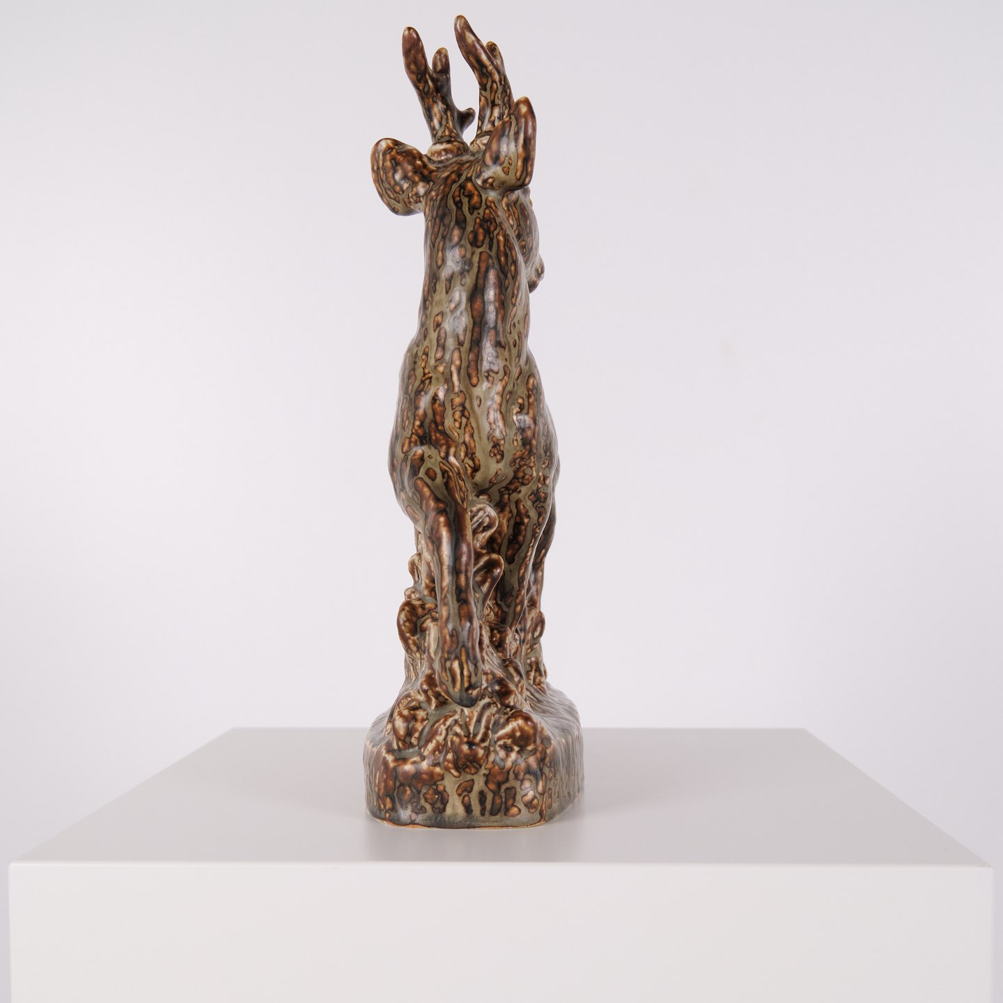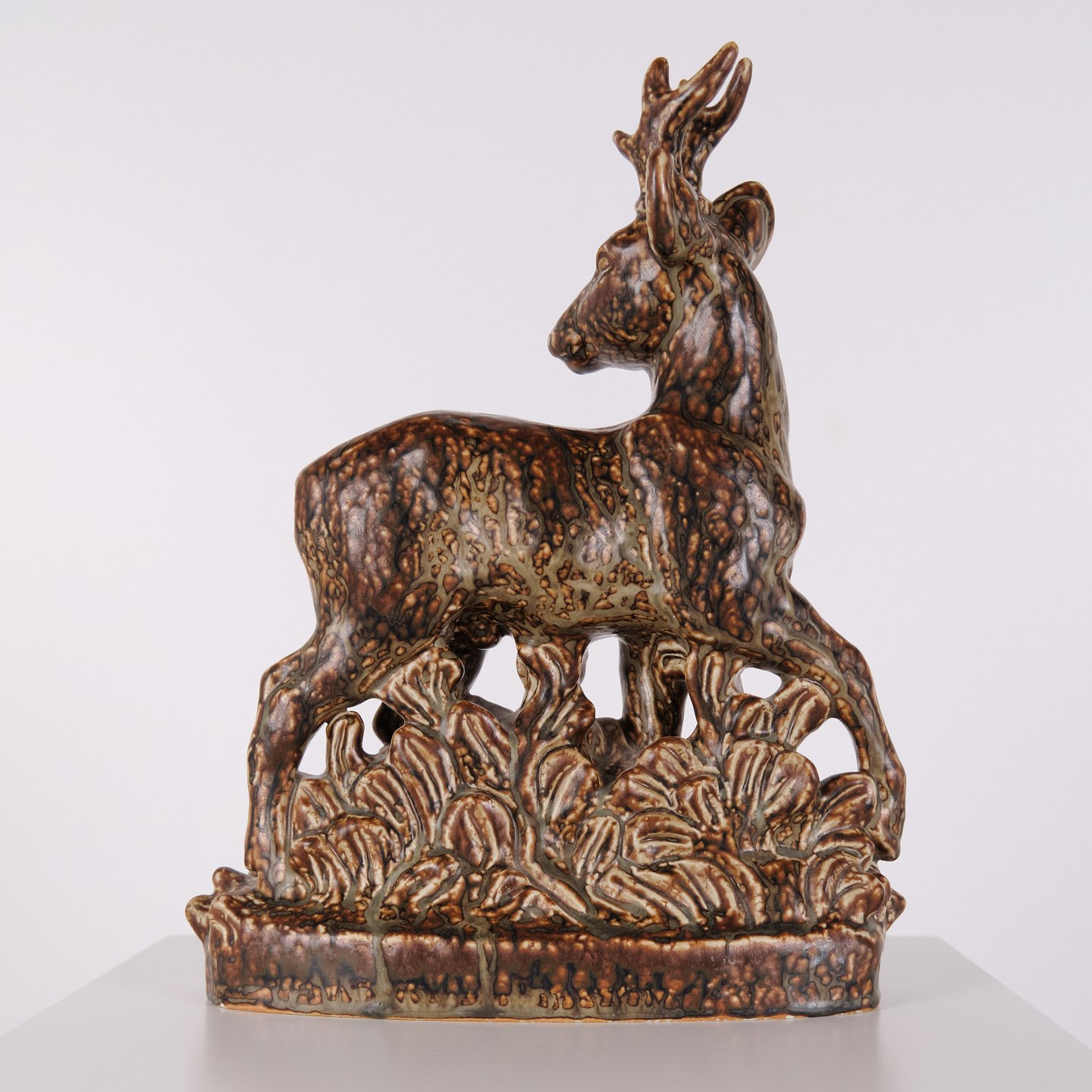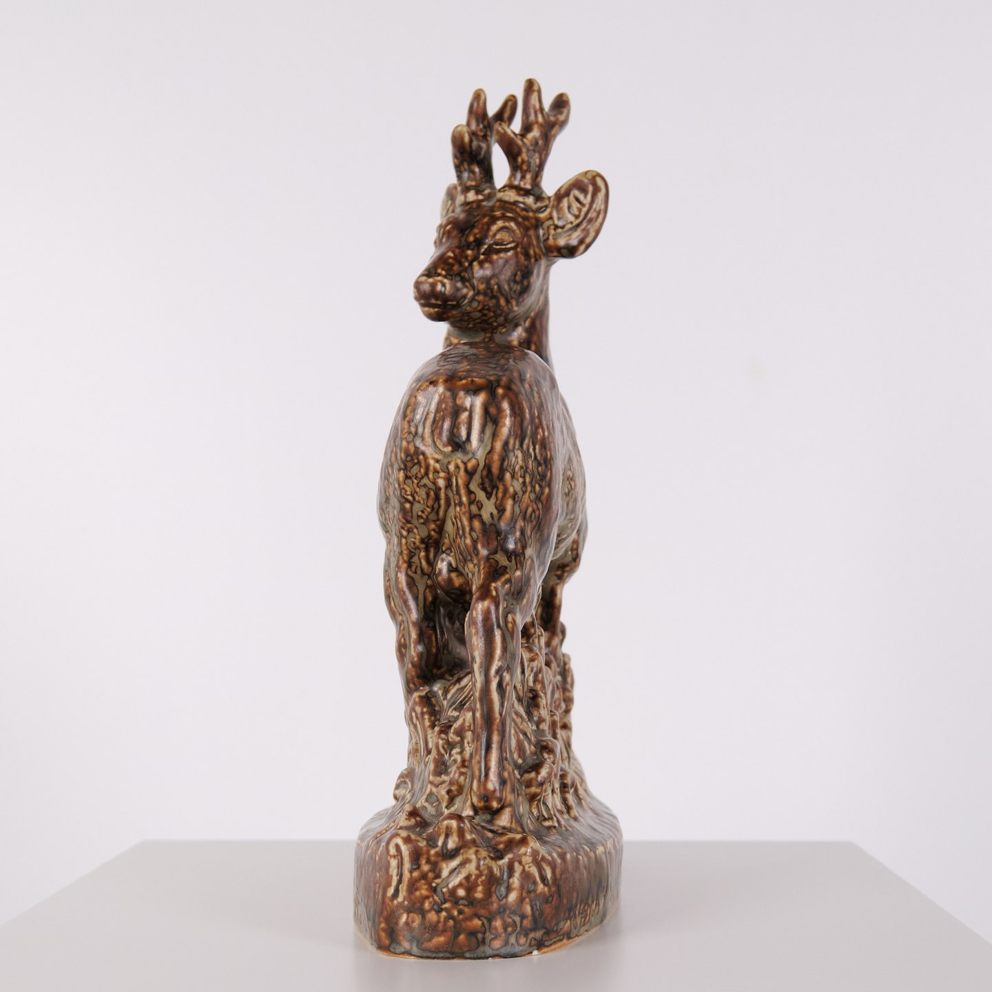 Beskrivelse: Stentøjsfigur med motiv af stående hjort, model nr. 21333, designet af Knud Kyhn for Royal Copenhagen. Figuren er udført i stentøj og indgår i Knud Kyhns serie af dyrefigurer produceret hos Royal Copenhagen i midten af det 20. århundrede. Modellen er kendetegnet ved en markant kropsform og tydelig bearbejdning af overfladen, som er gennemgående for Kyhns arbejde med naturmotiver.