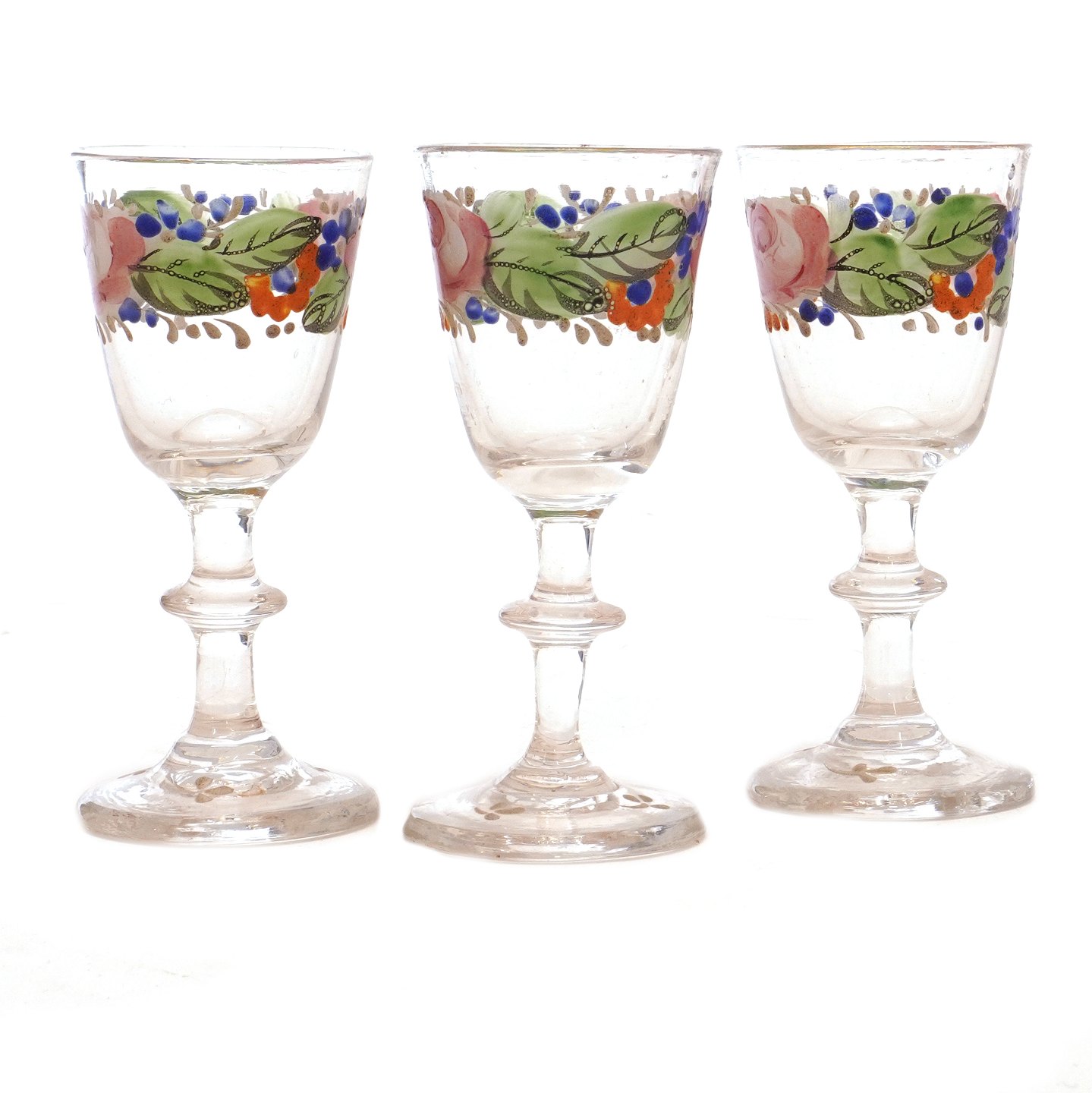 Sæt på tre emaljedekorerede glas. Ca. år 1860. H: 9,6cm