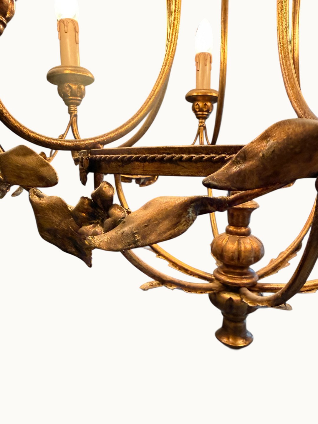 Beskrivelse: Burformet metal og træ lysekrone til elektricitet i Louis XVI stil, diameter ca. 60cm *fin og funktionsdygtig stand*