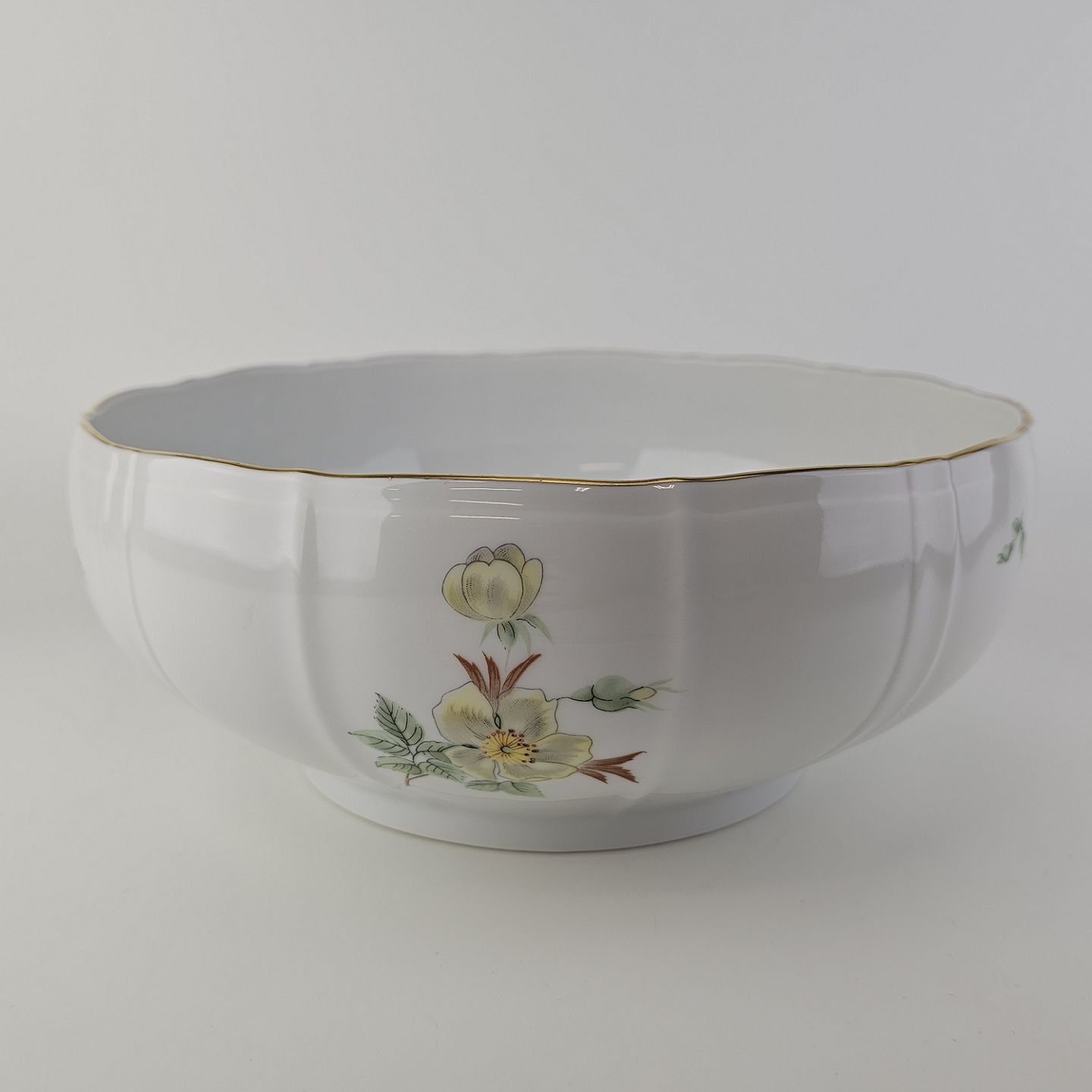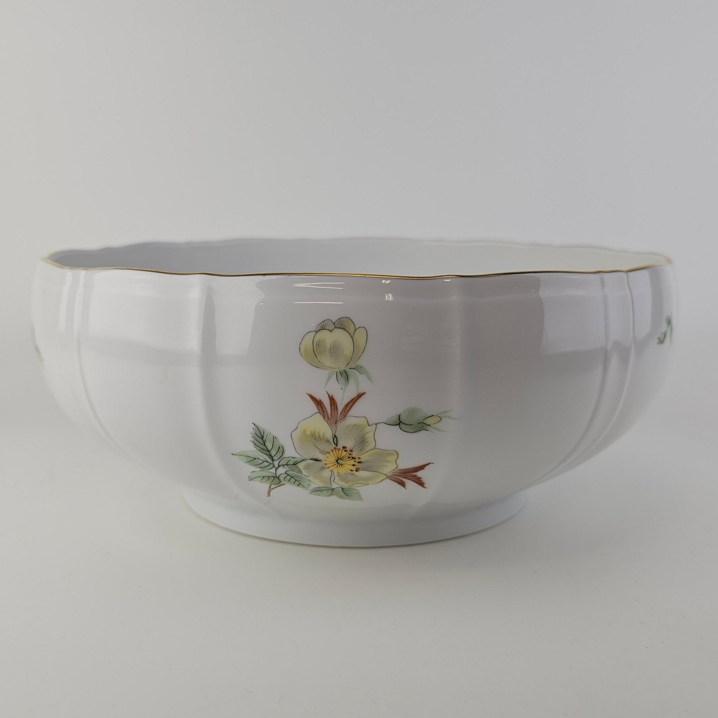 Service i glat hvidt porcelæn med lige knækkede kanter dekoreret med gule blomster og gylden kant