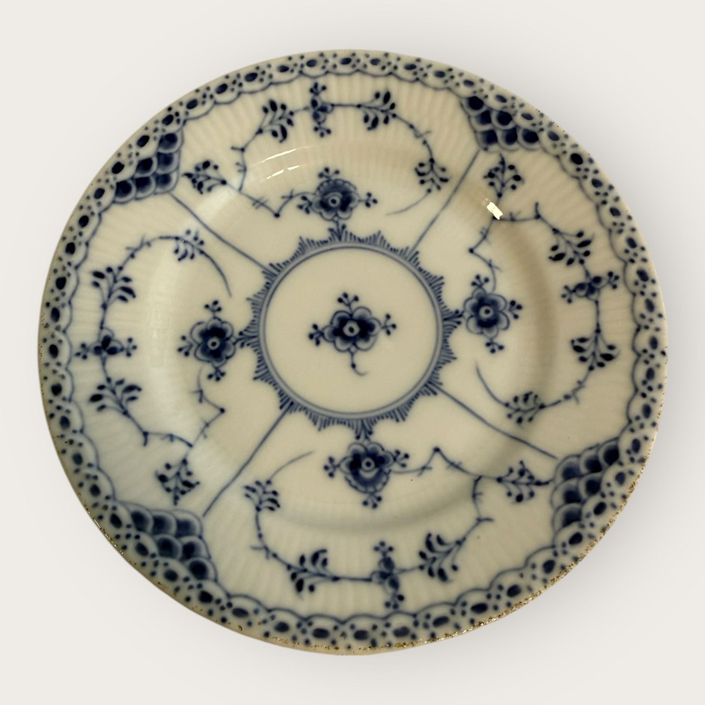Beskrivelse: Royal Copenhagen, Musselmalet, Halvblonde, Kagetallerken #1/575, 16cm i diameter, 3.sortering / medarbejdersortering *Lidt sorte prikker under glasuren langs kanten ellers pæn stand*