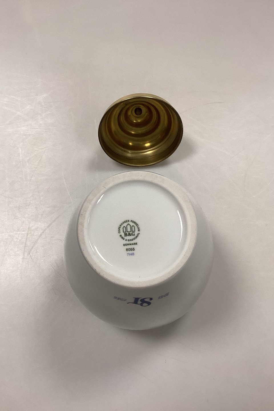 Beskrivelse: Bing og Grøndahl Tobakskrukke - Tabac No.6055/7148. Fremstillet i anledning af Skandinavisk Tobakskompagnis 25-års Jubilæum (1961-1986). Porcelæn med messinglåg. Logo på bagsiden: 1961 ST 1986.