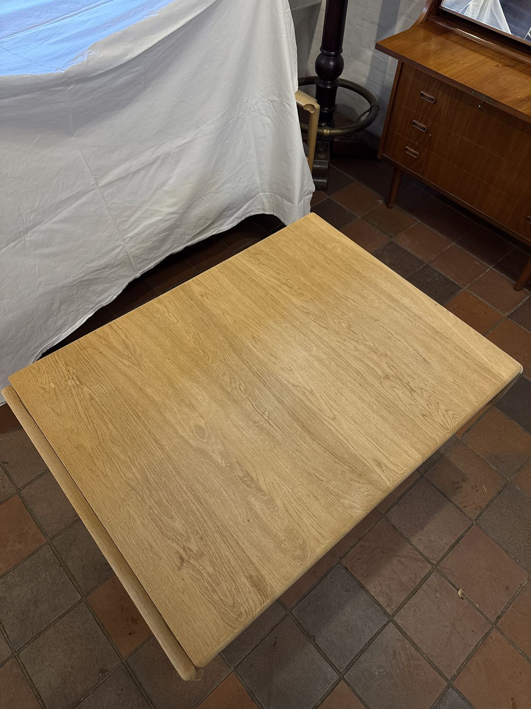 Beskrivelse: Hans J. Wegner sofabord m. Klapper model GE85 udført i massiv sæbehandlet egetræ. Fremstillet hos Getama i 1990’erne.