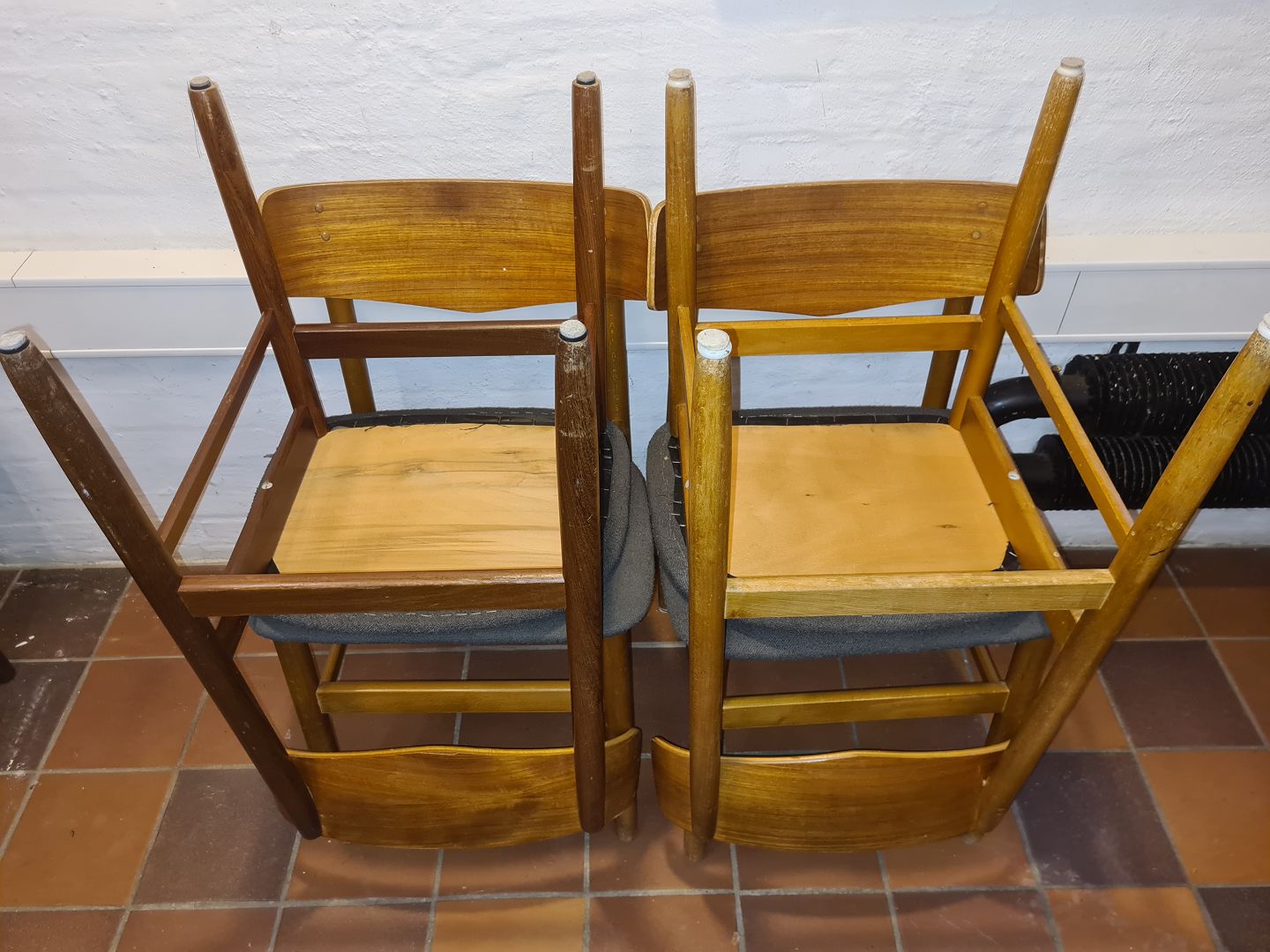 Bemærk 1 stol med stel og ryg i teak. 3 stole med ryg stykke i teak og sel i bøg.