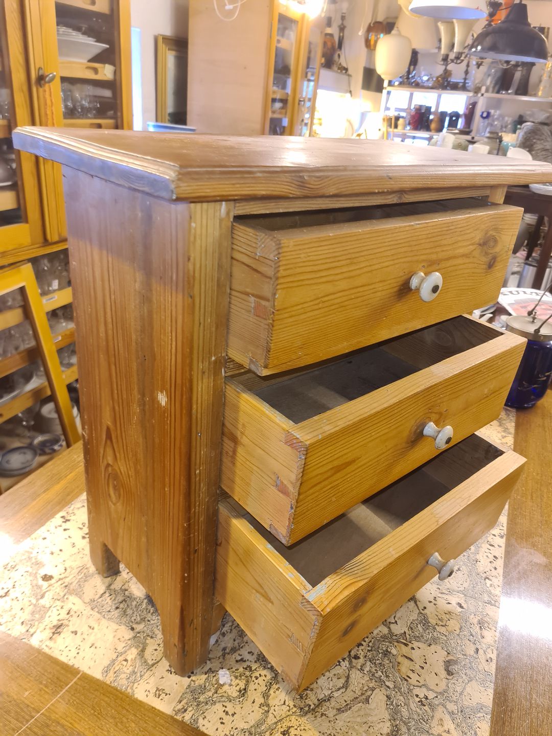 Beskrivelse: Lille kommode i massiv fyrretræ.