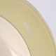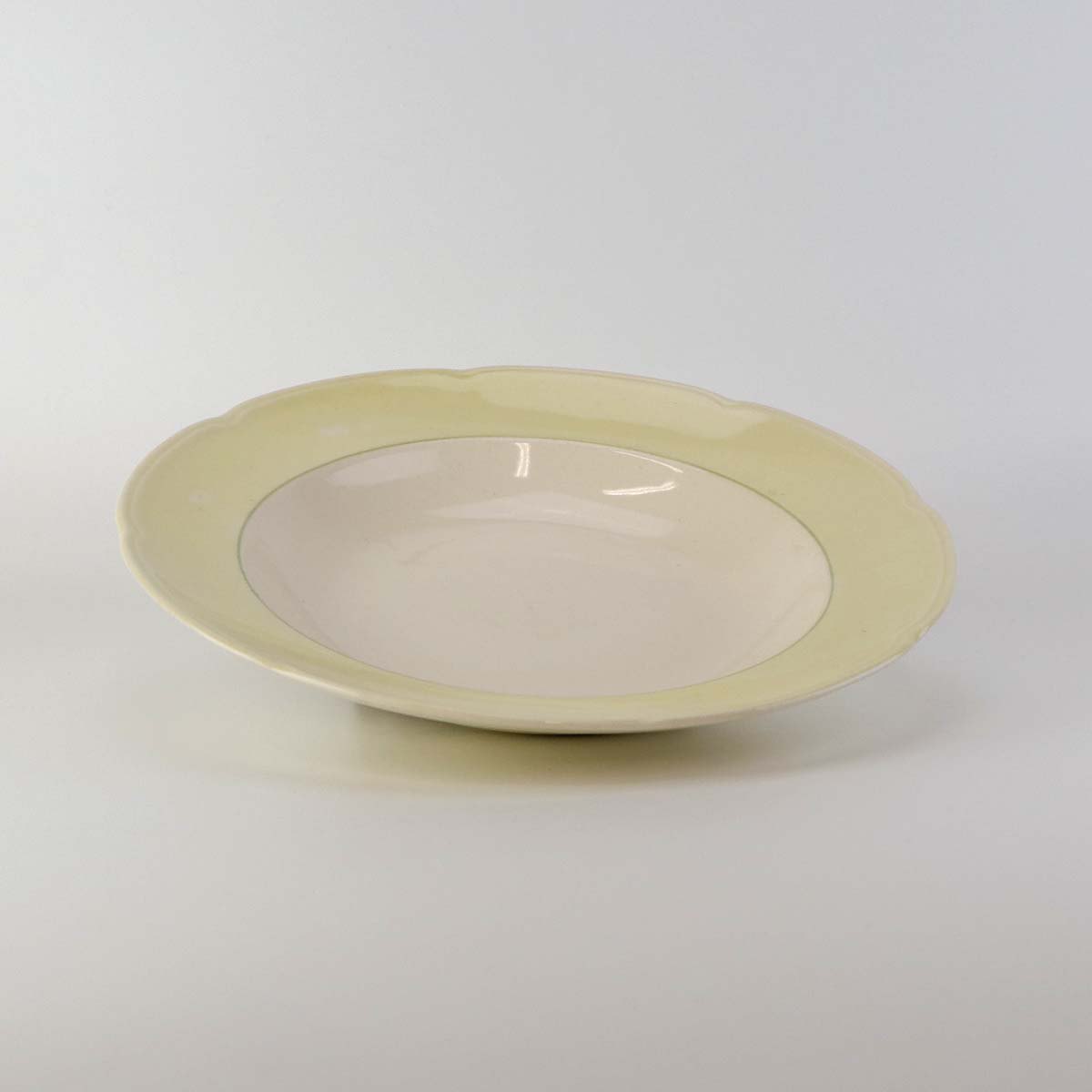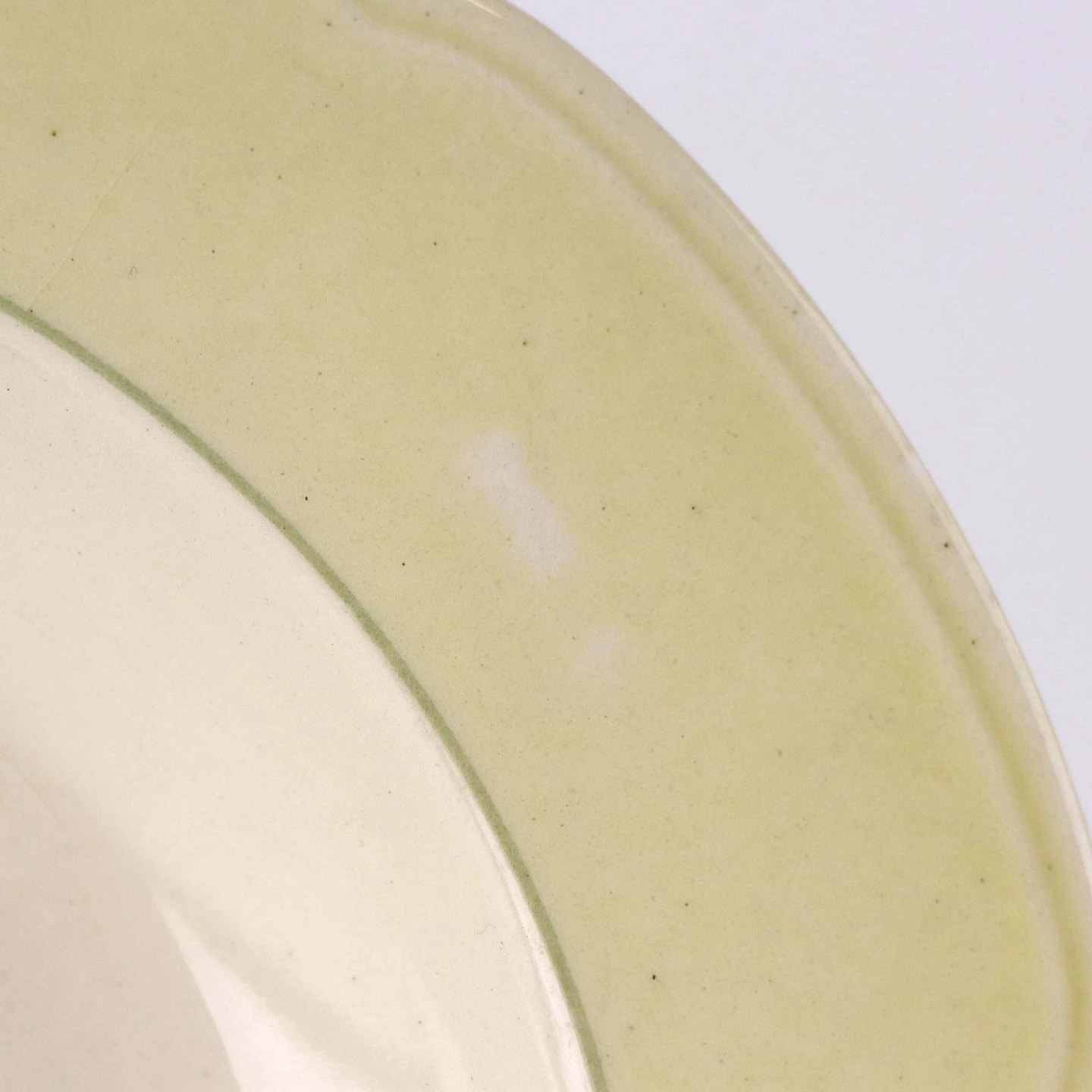 Fajancestel med gul dekoration på lys baggrund og med vissengrøn streg.