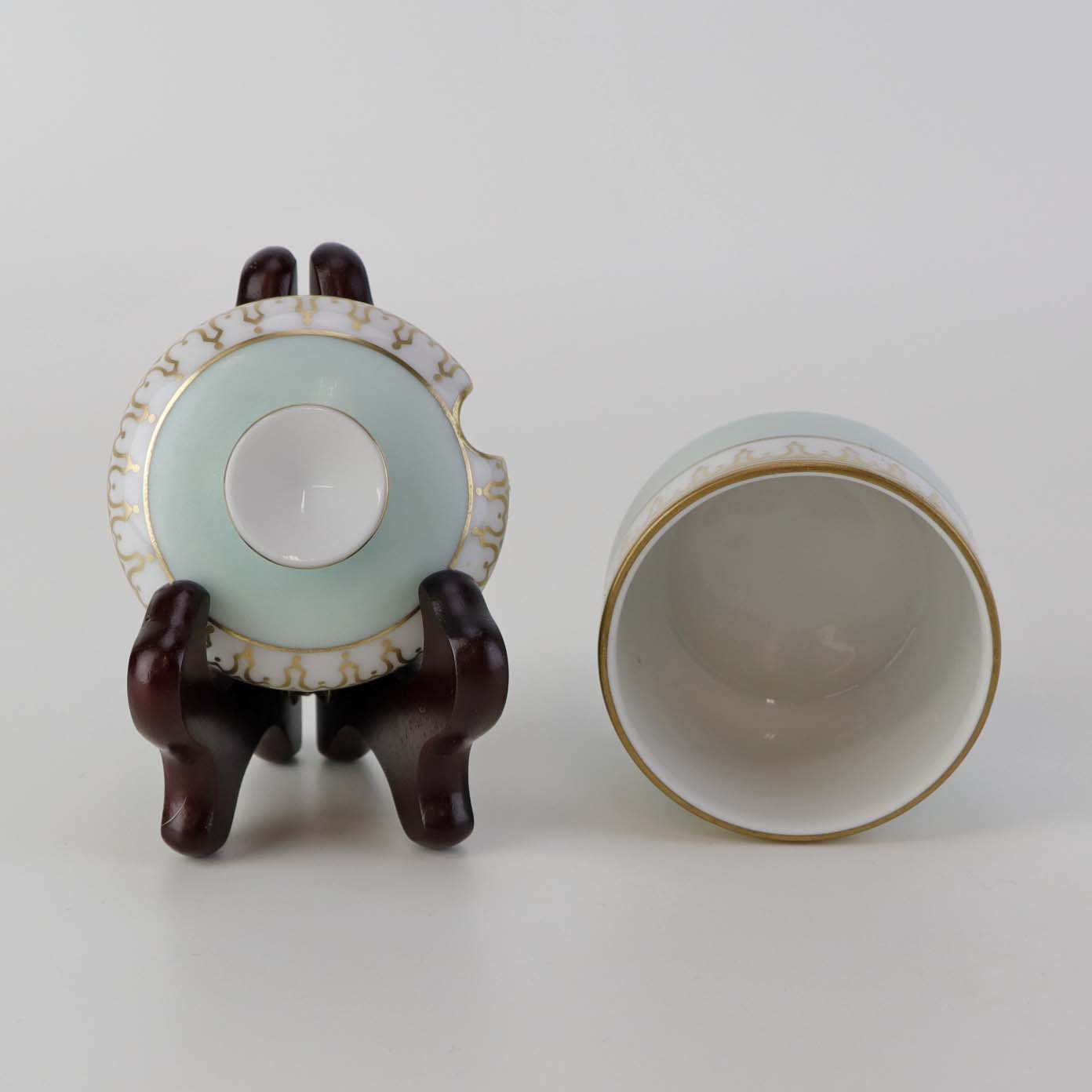 Thorvaldsen er stel i glat hvidt porcelæn med lysegrøn bort, forgyldt dekoration og guldkant