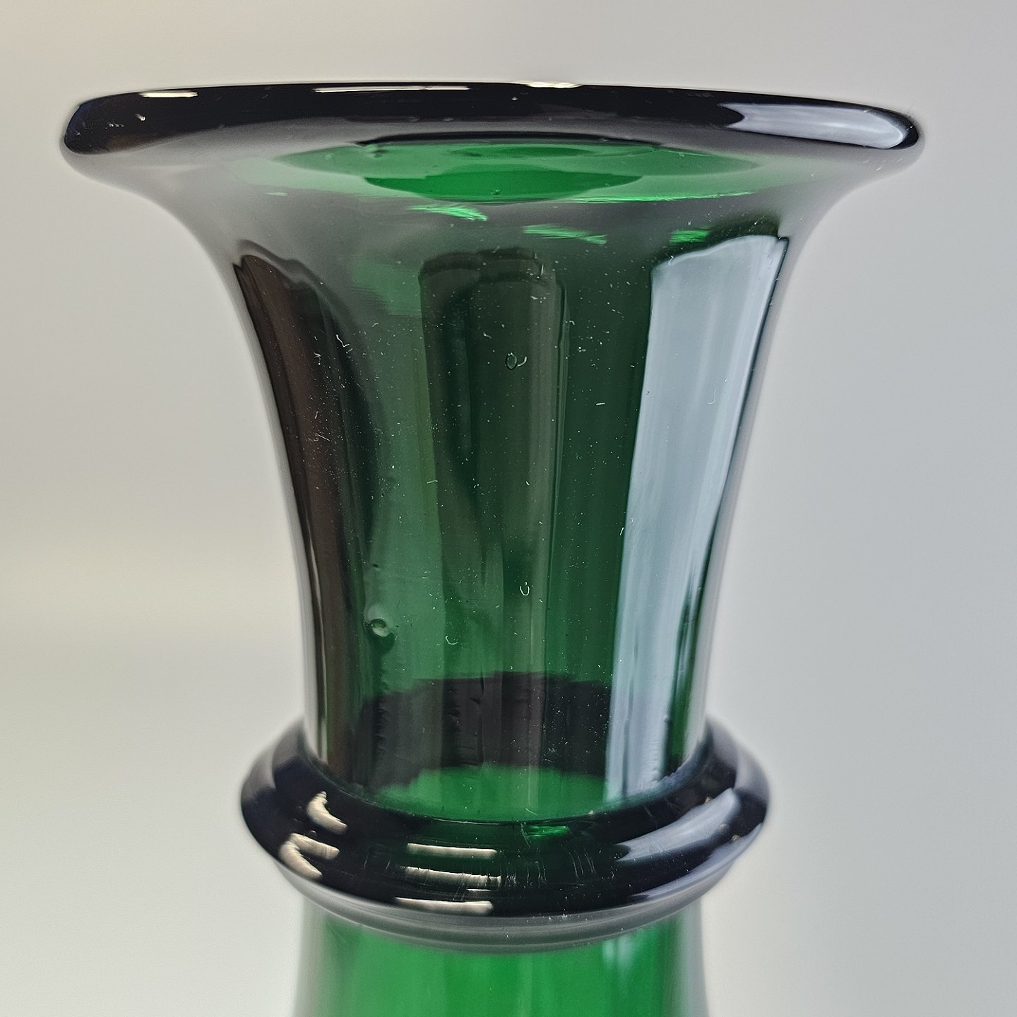 Beskrivelse: Håndblæst balusterformet hyacintvase i grønt glas