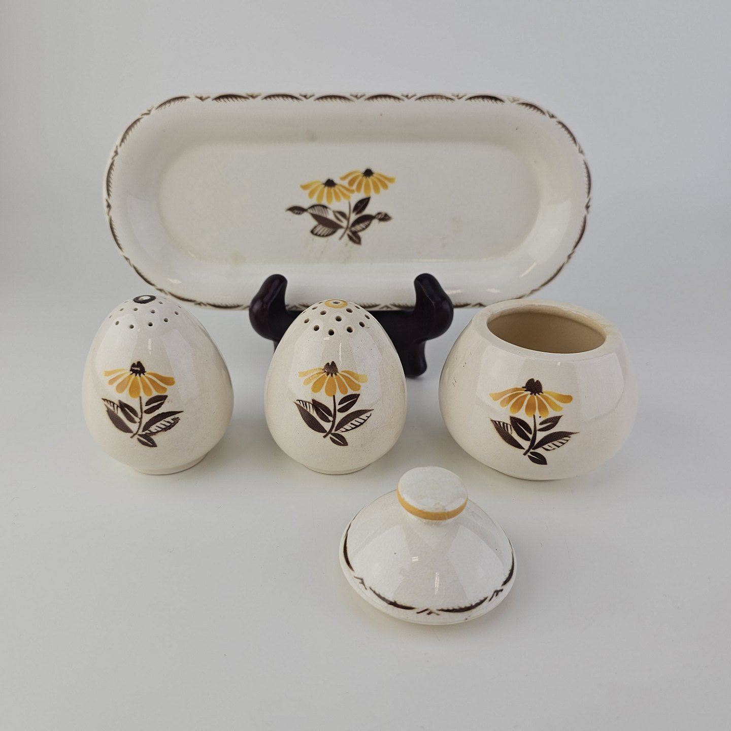 Beskrivelse: Trekantet fad med sennepskrukke, saltbøsse og peberbøsse i fajance fra stellet Birthe