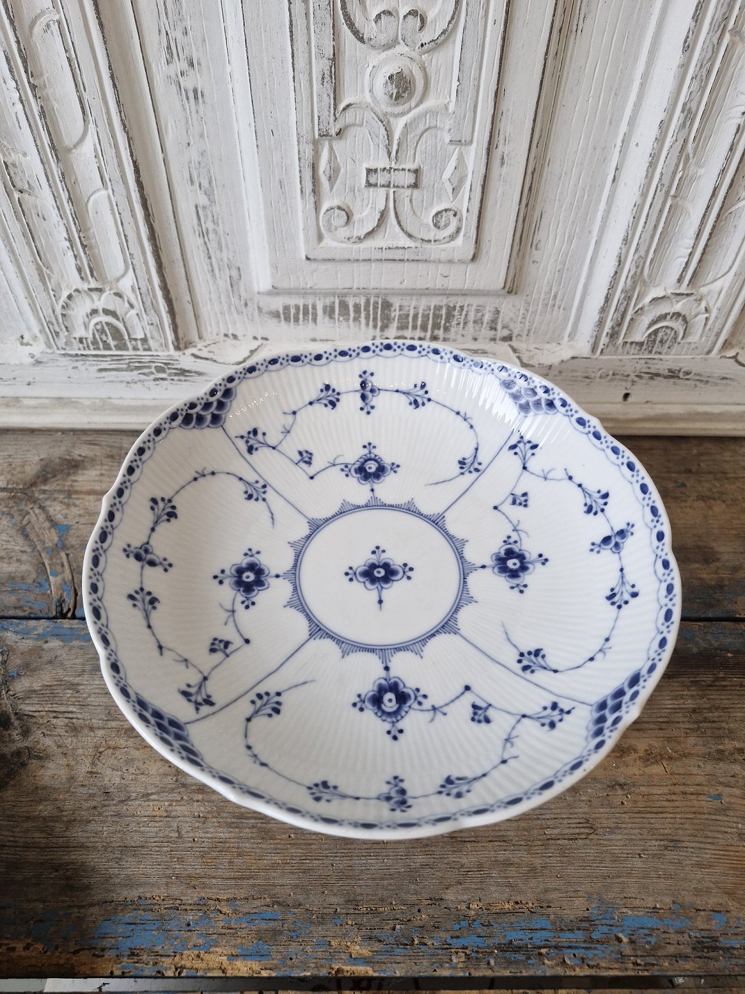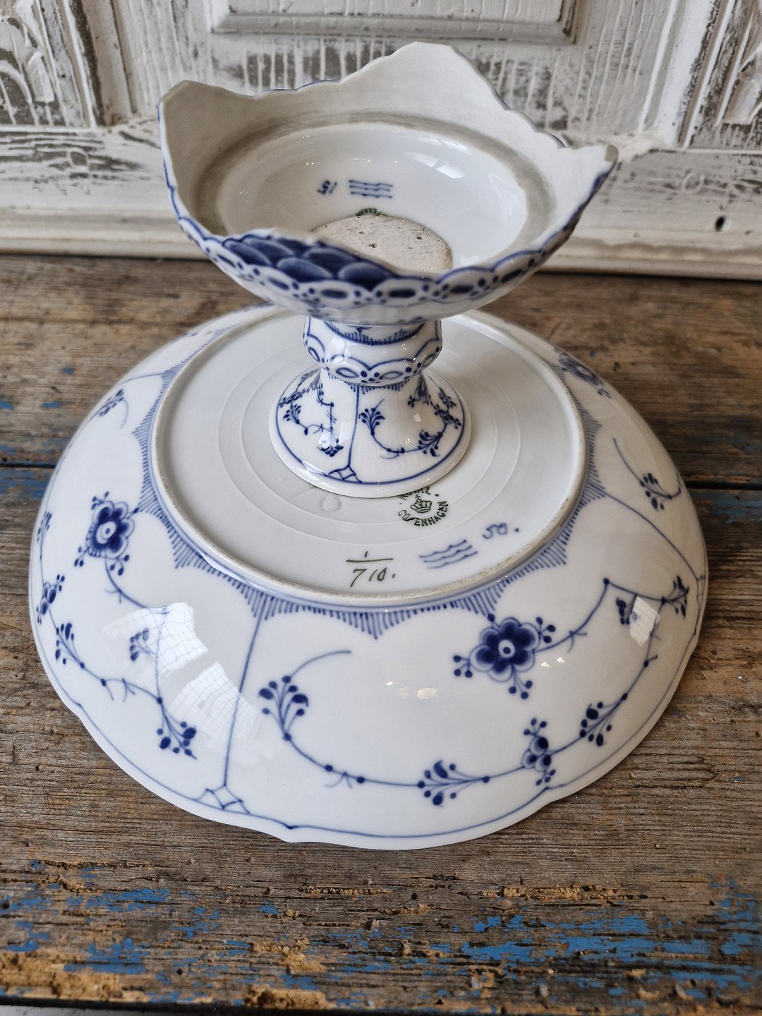 Beskrivelse: Royal Copenhagen Musselmalet halvblonde opsats med bølget kant