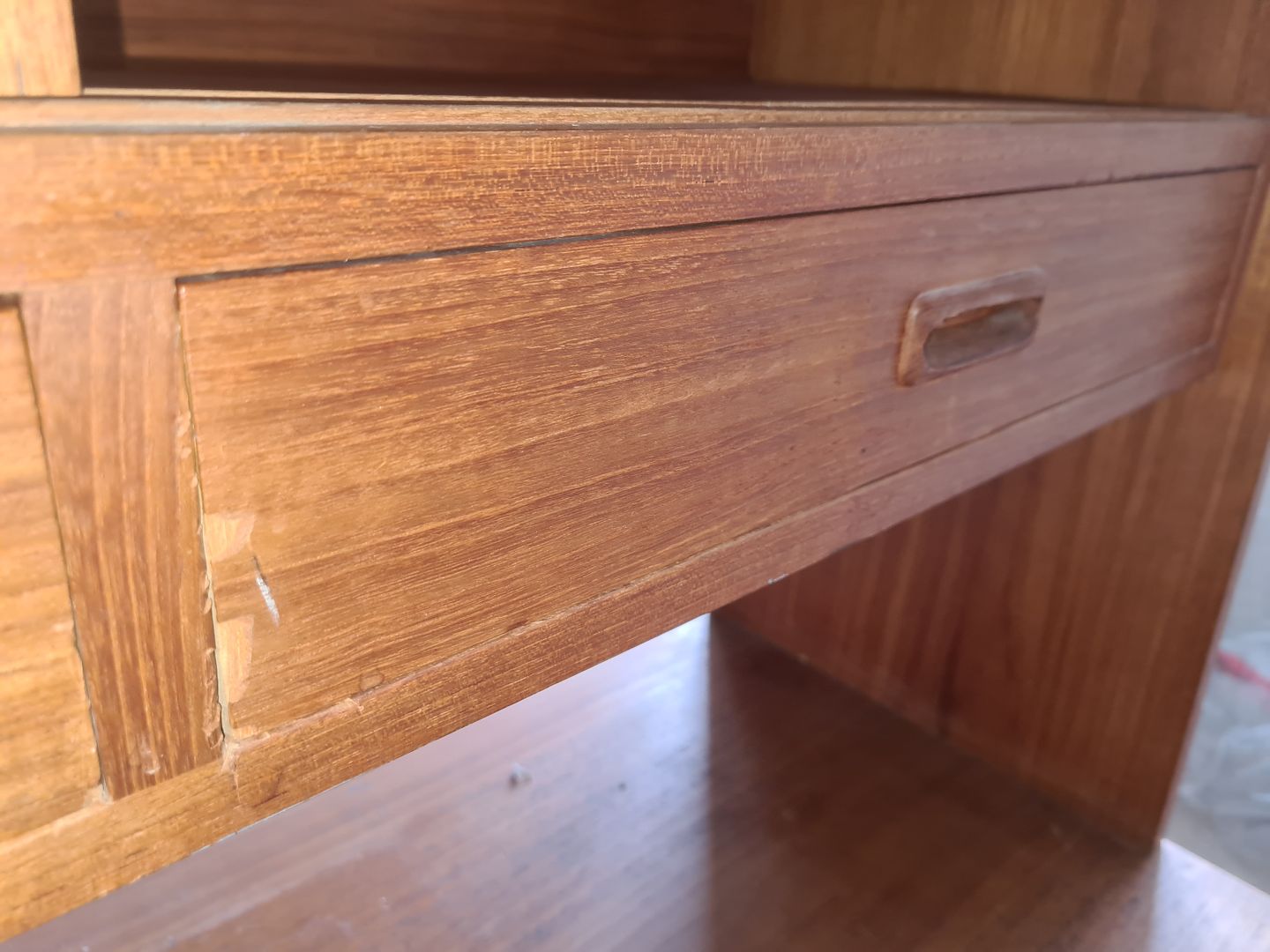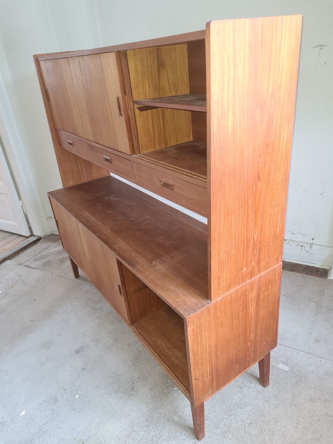 Beskrivelse: Dobbelt skænk fra 1960'erne i teakfinér. Fremstår pæn og ok velholdt, dog med manglende hylde nederst til højre og enkelte finér skader. (Billede)