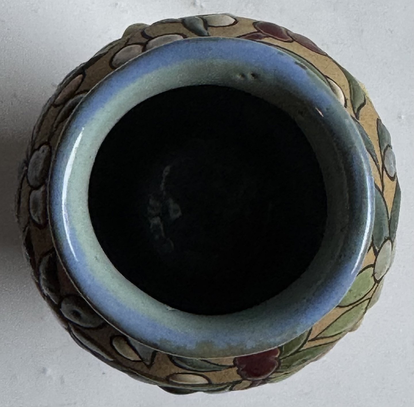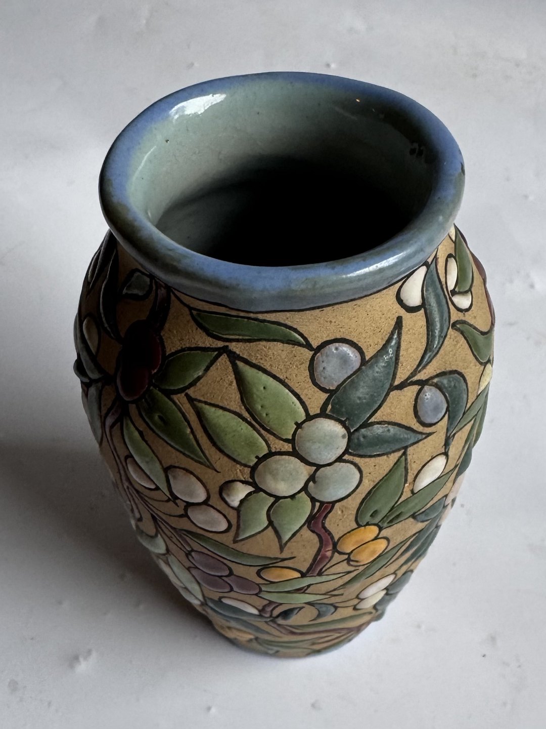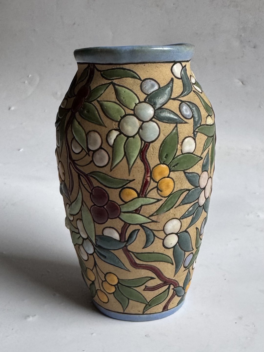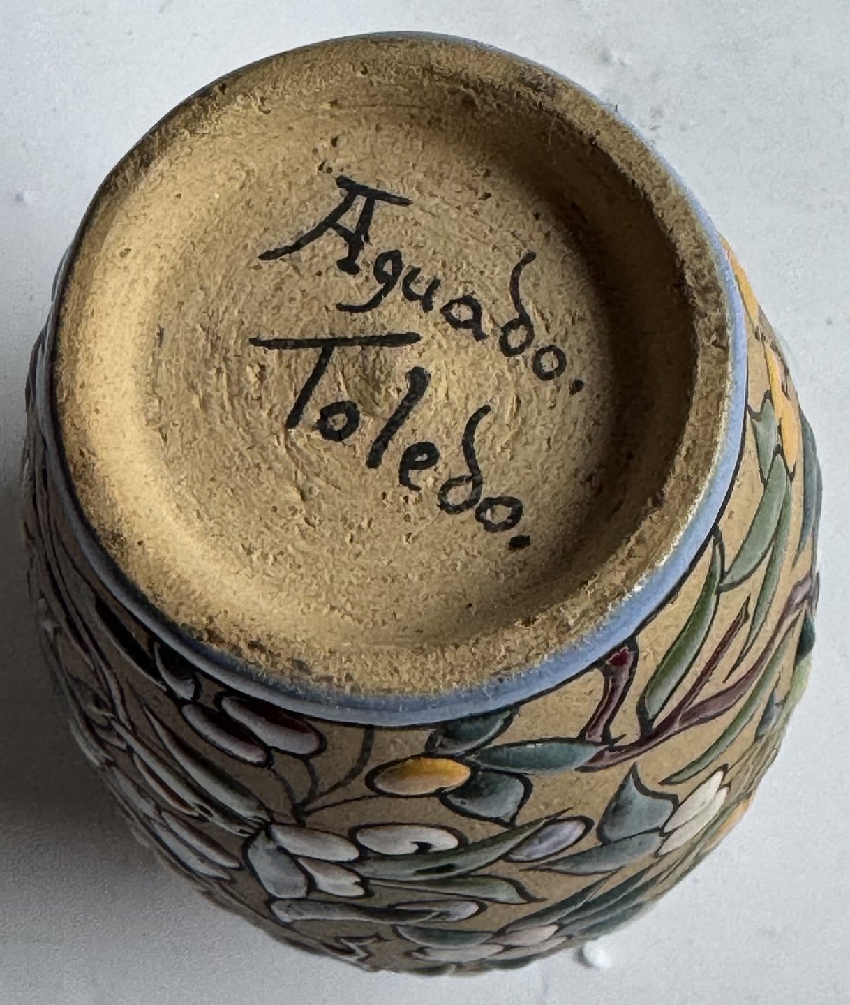 Beskrivelse: Arguado Toledo vase i keramik med farverig emalje blad og bær dekoration rundt om vasen. Grundlæggeren af dette produkt José Aguado Villalba (1919-2007) havde en mangeårig produktion af keramik i lignende stil fra midten af 1960’erne til i slutningen af 1980’erne i Toledo i Spanien. Vasen er 10,7 cm høj.