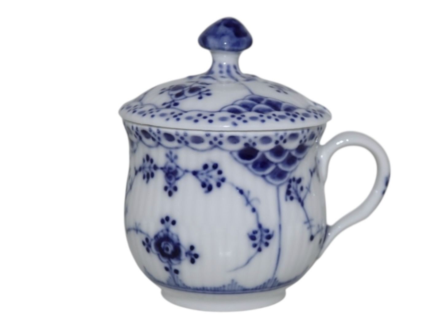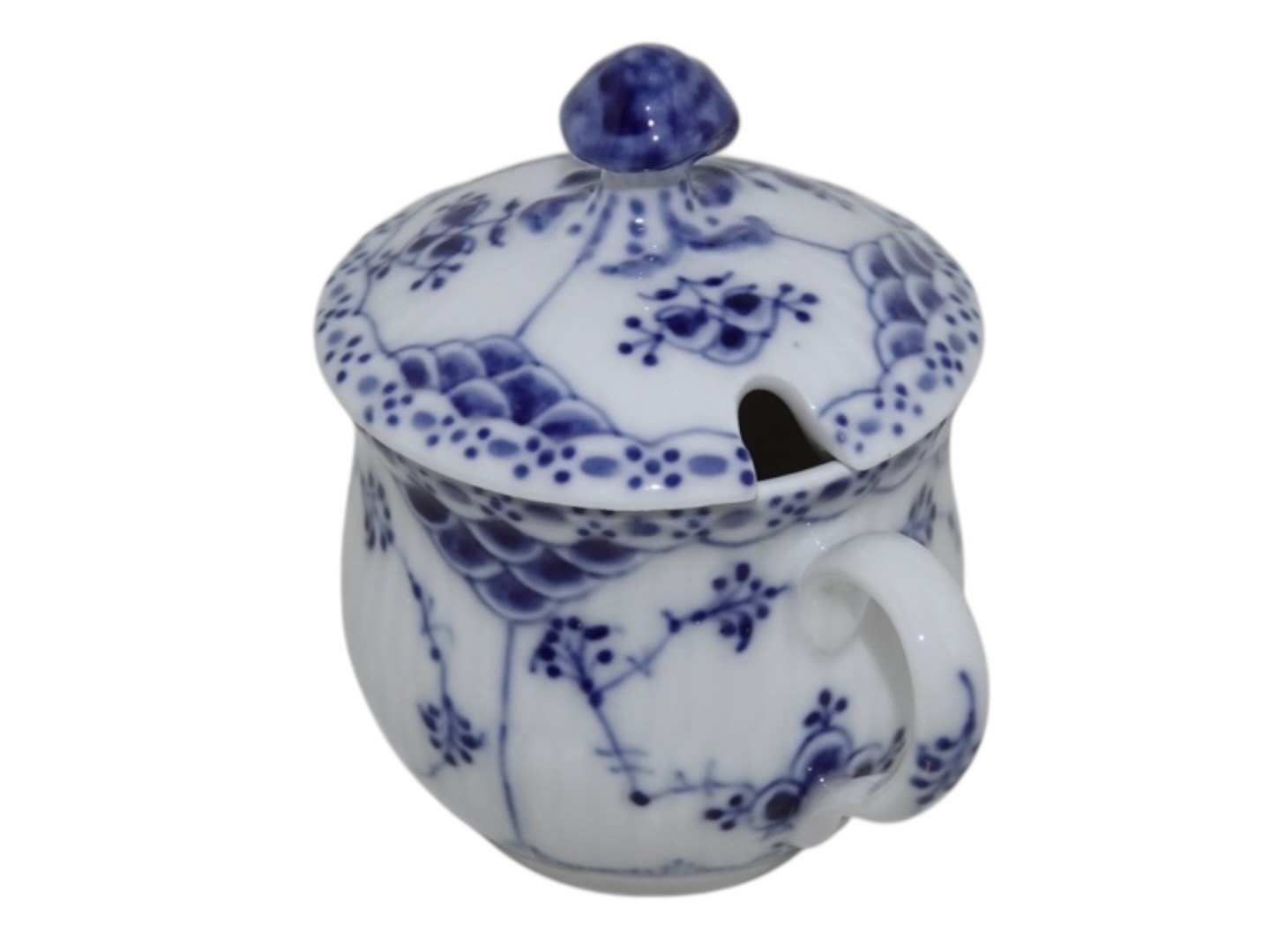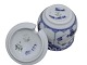 Beskrivelse: Royal Copenhagen Musselmalet Halvblonde, sennepskrukke med tilhørende låg fra 1923.