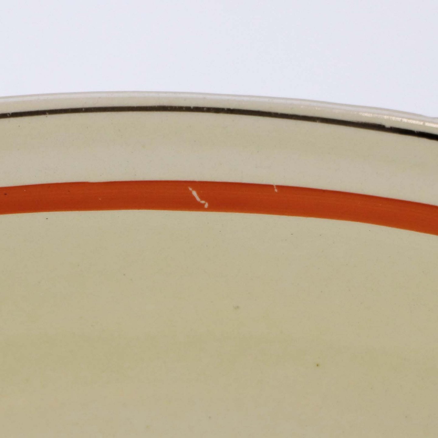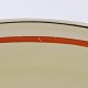 Fajancestel med dekoration af blomsterkurv på gullig baggrund med orangerød kant stribe.