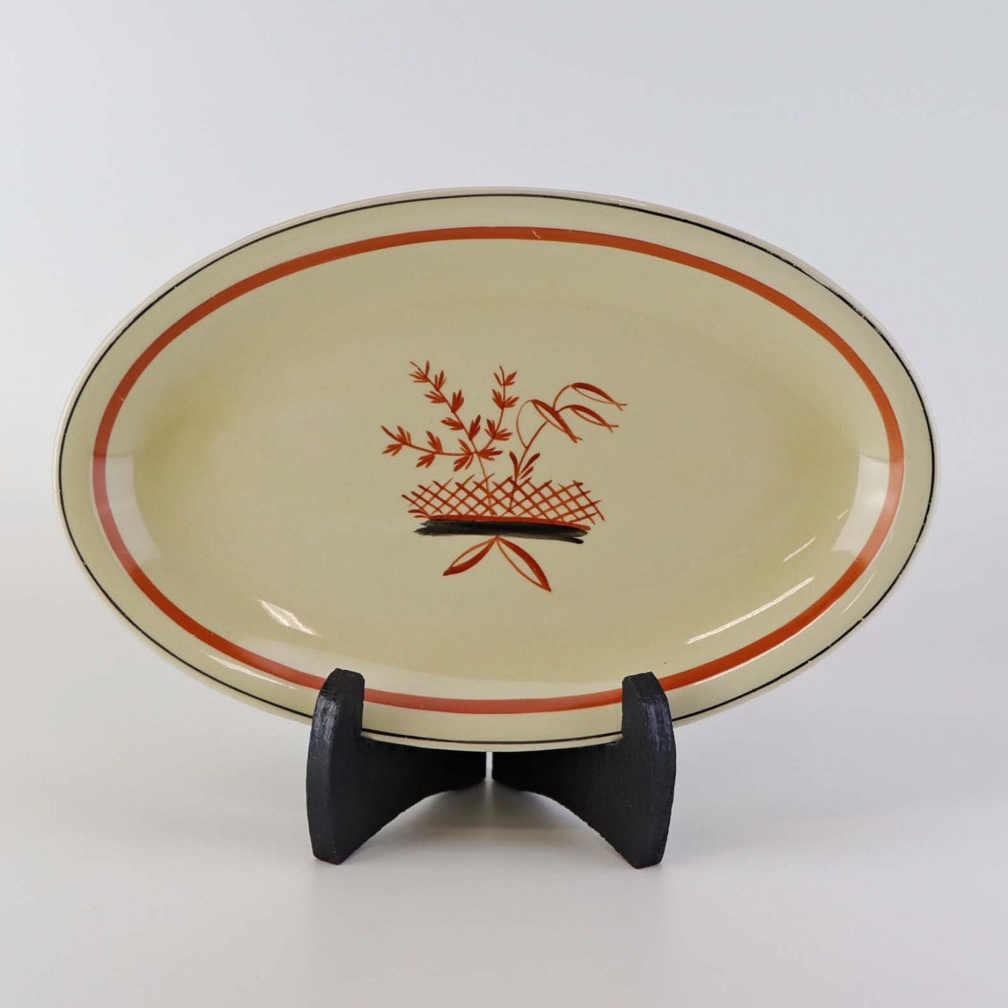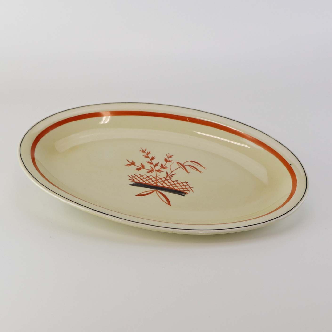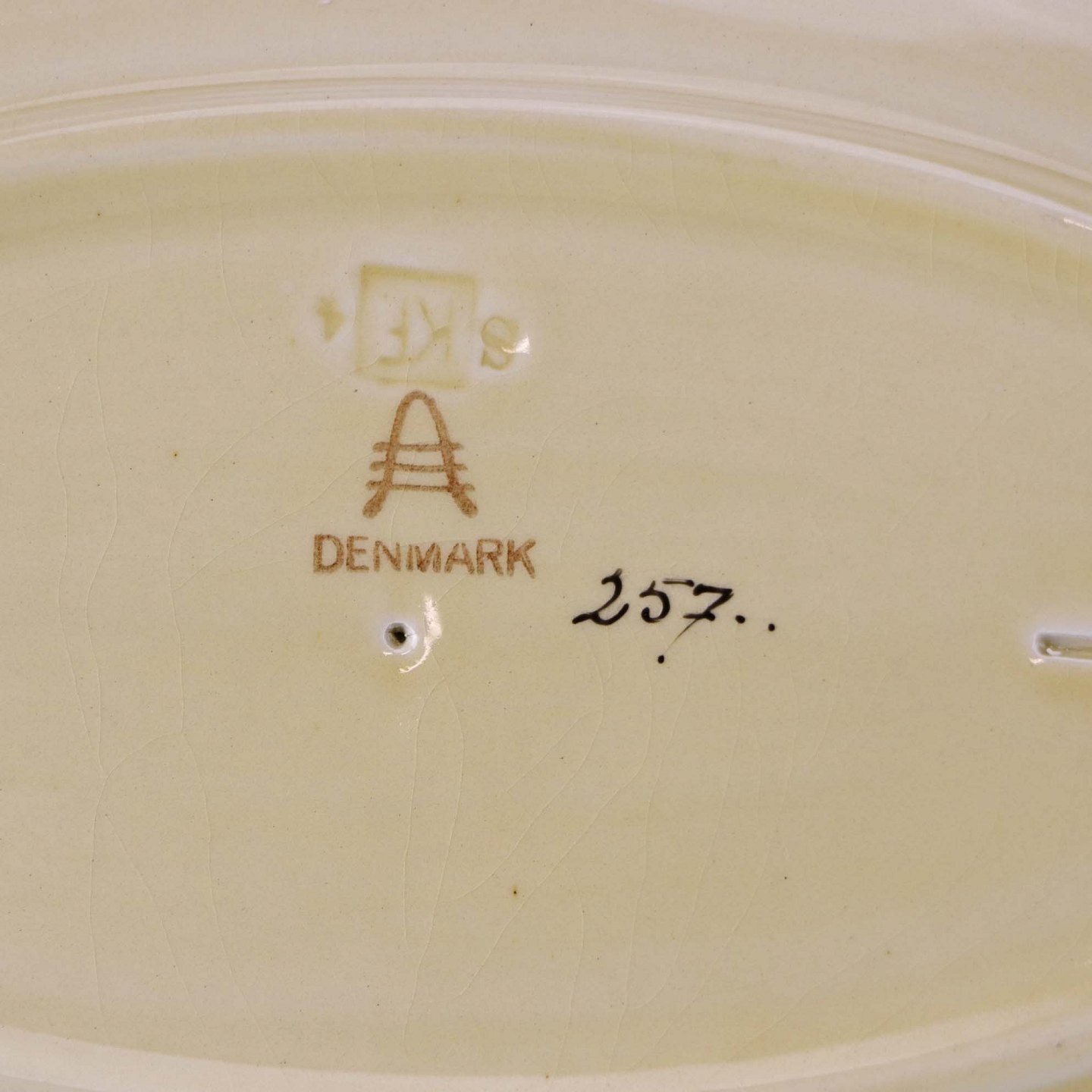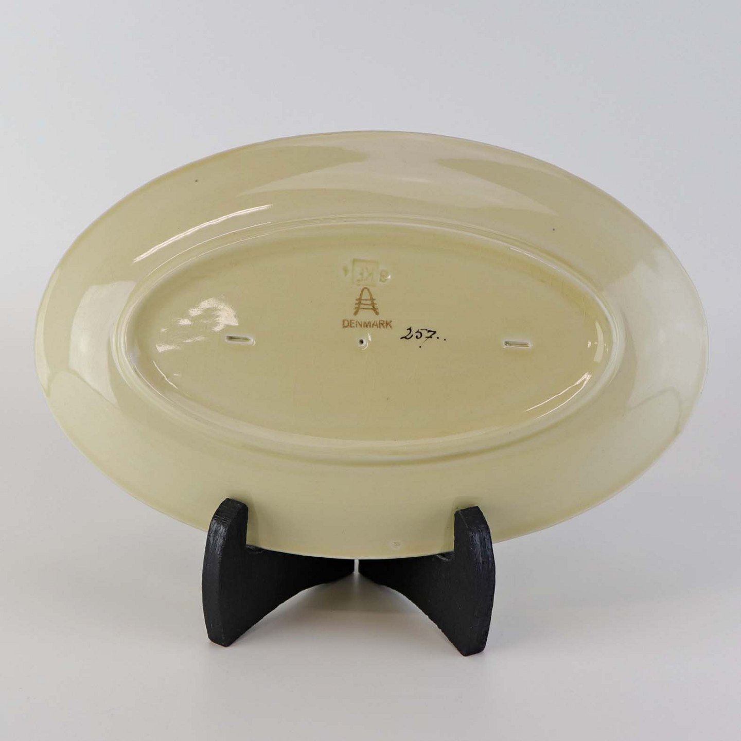 Beskrivelse: Mindre ovalt serveringsfad i fajance fra stellet Mariager. Nr. 257