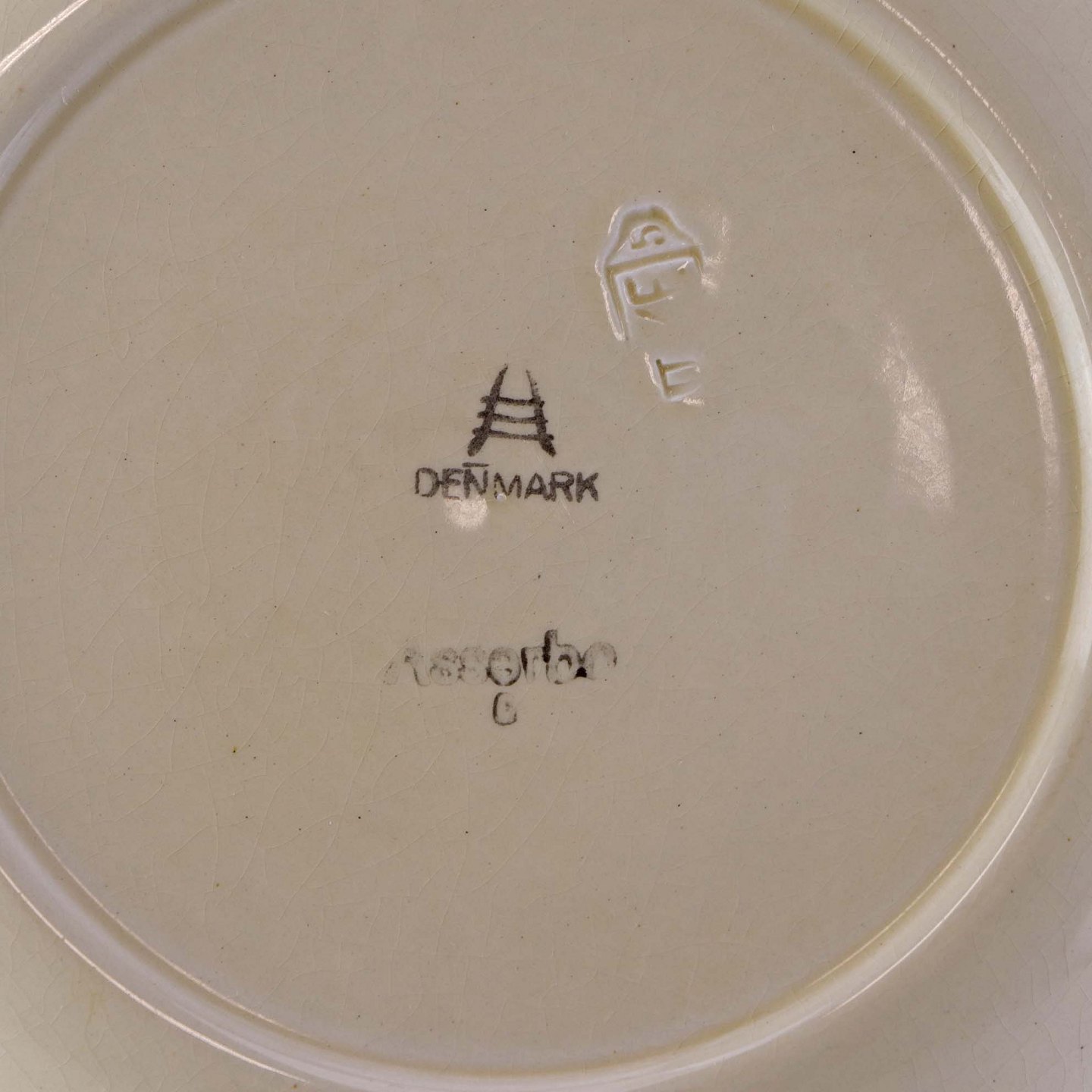 Beskrivelse: Lille dyb tallerken i fajance fra stellet Asserbo fremstillet i perioden 1933-1965