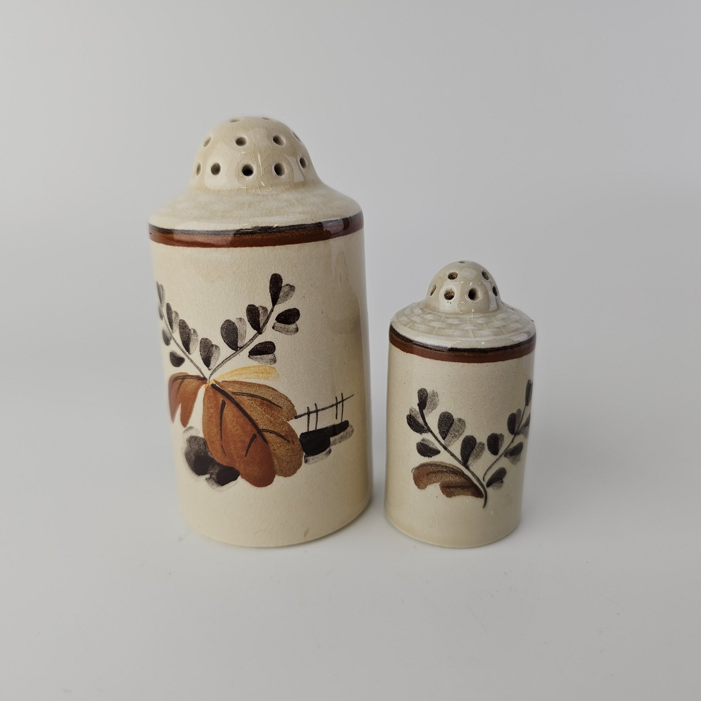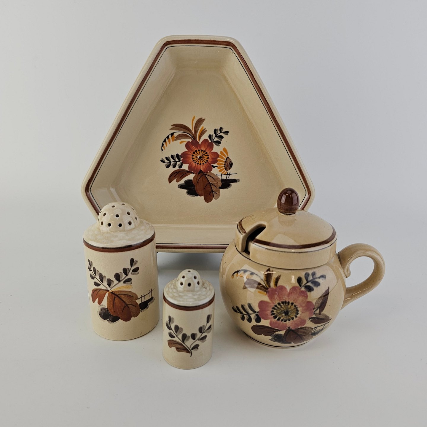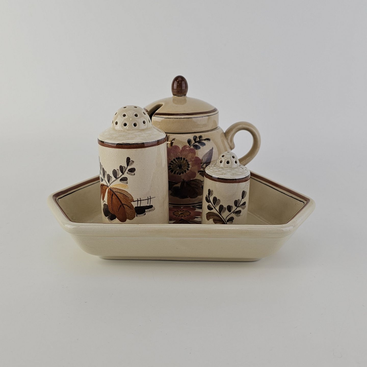 Beskrivelse: Plat de menage med peberbøsse, saltbøsse og sennepskrukke i fajance fra stellet Knud
