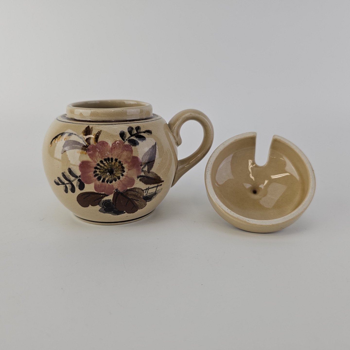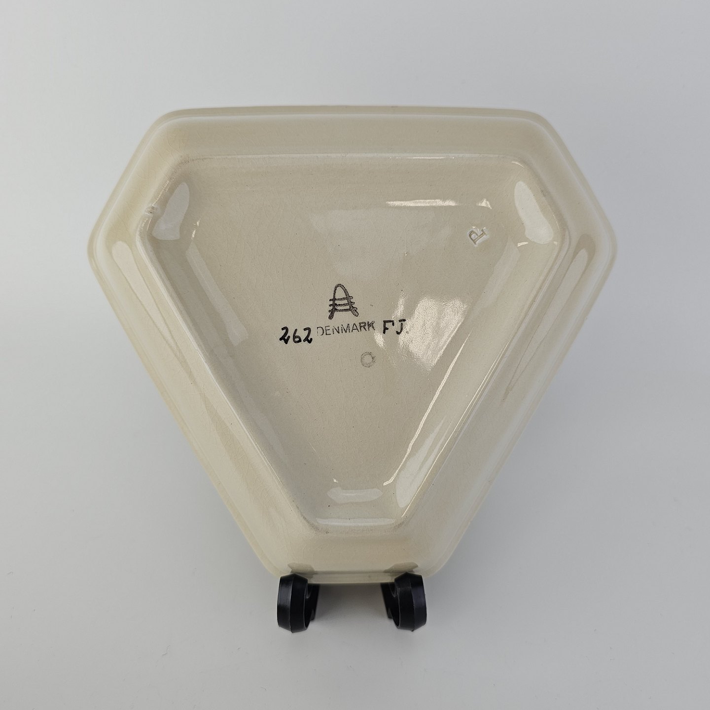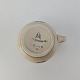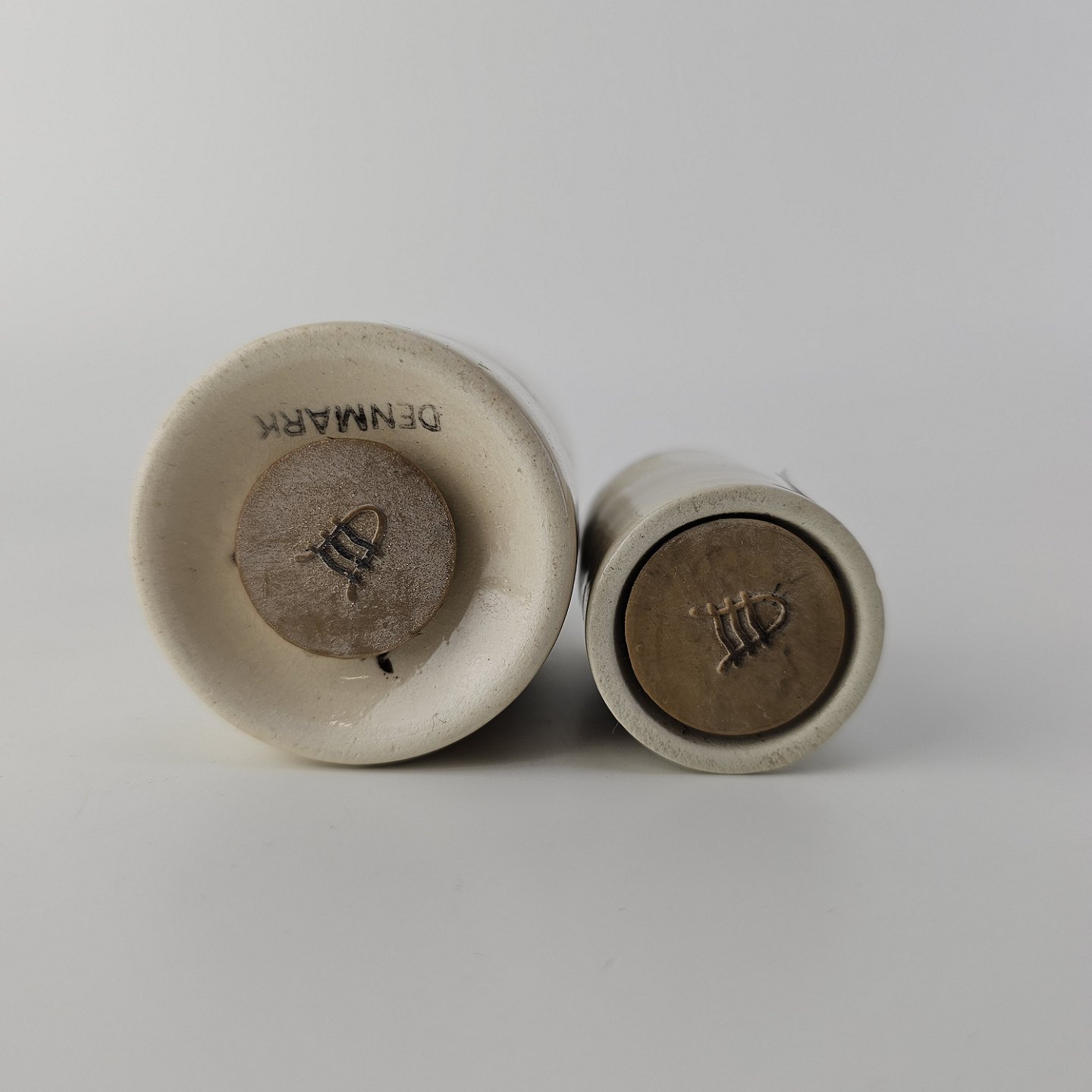 Beskrivelse: Plat de menage med peberbøsse, saltbøsse og sennepskrukke i fajance fra stellet Knud