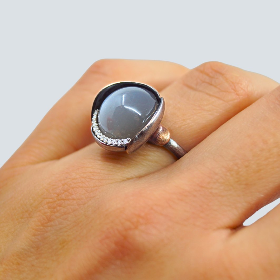 Charlotte Lynggaard for Ole Lynggaard; Lotus ring no. 3 in sterling silver, with moonstone and 13 brilliant-cut diamonds, a total of 0.08 ct. TW. VS. One of the leaves in 18k gold.