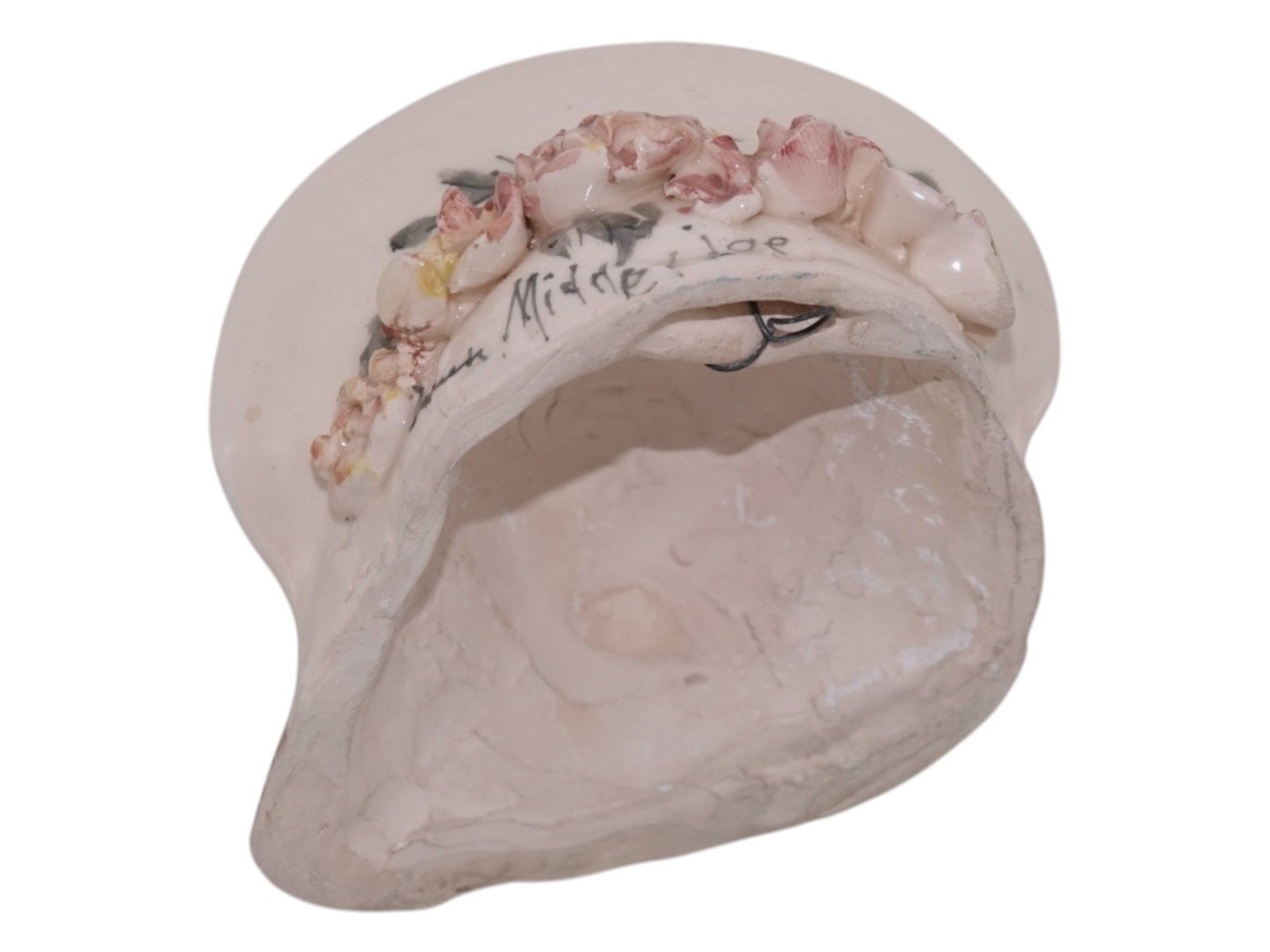 Beskrivelse: Doreen Middelboe keramik, væghængt figur af dame med blomsterhat.