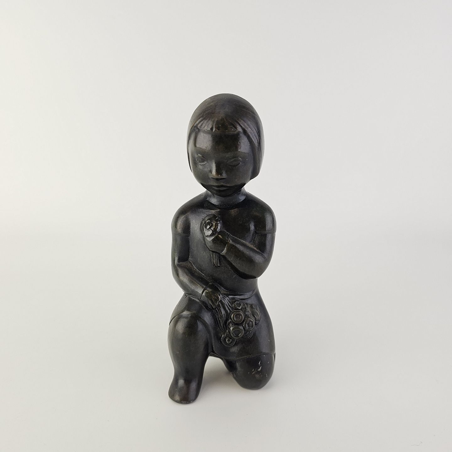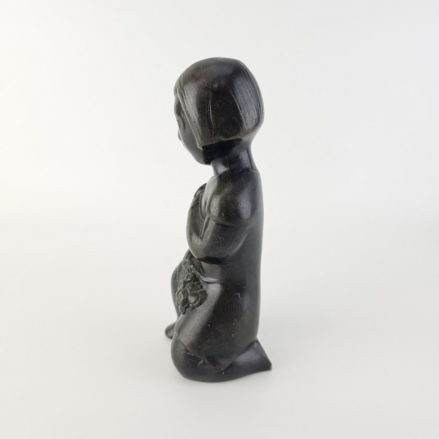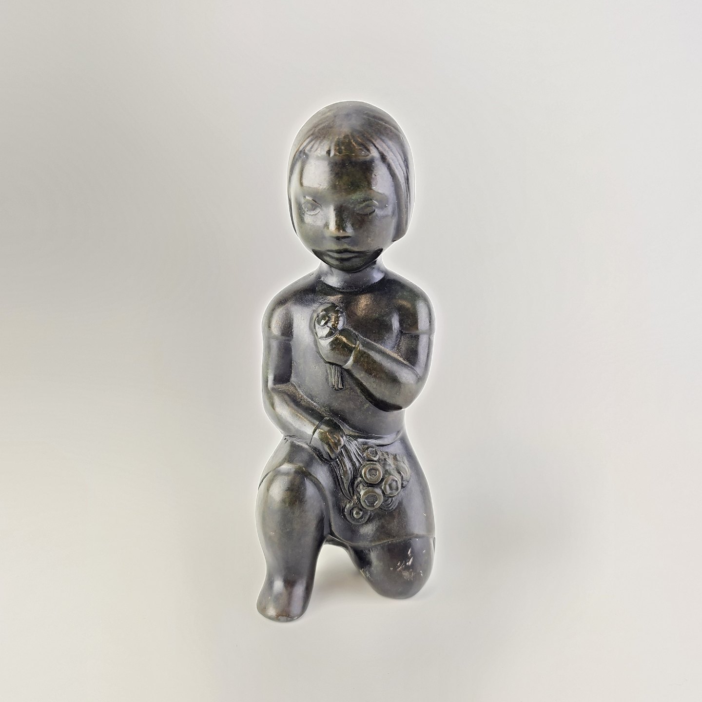 Beskrivelse: Grønlandsk figur med motiv af en knælende person med blomster Diskometal