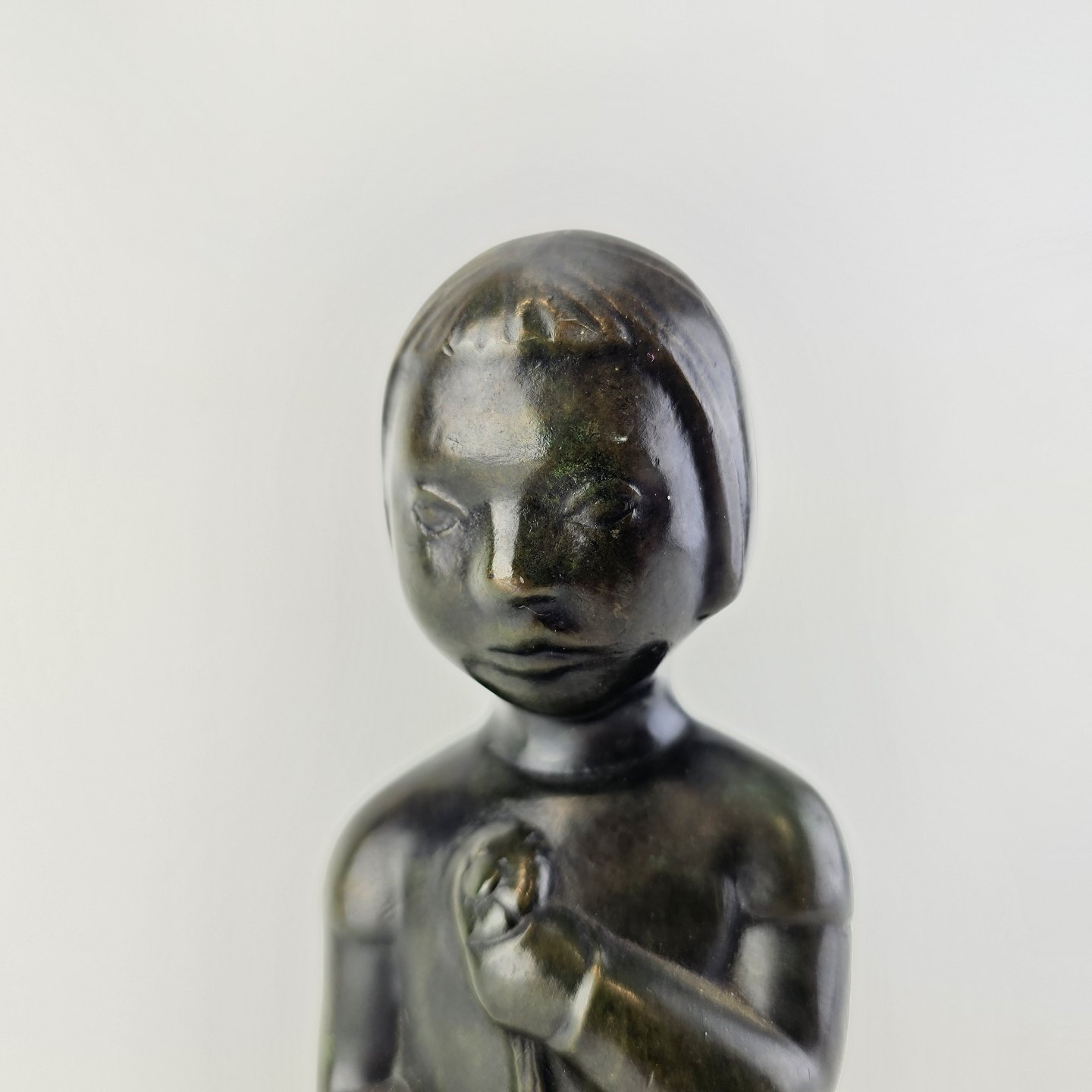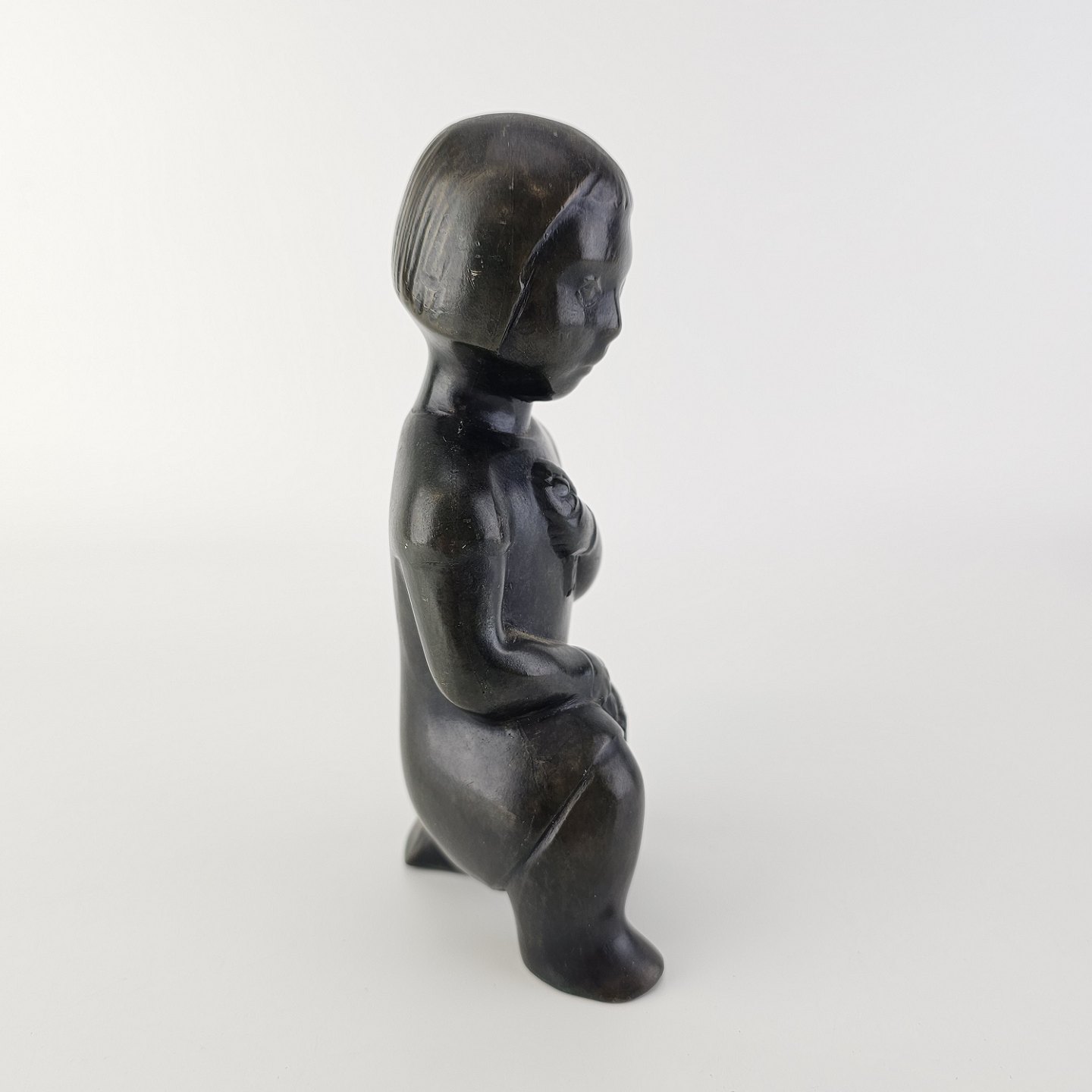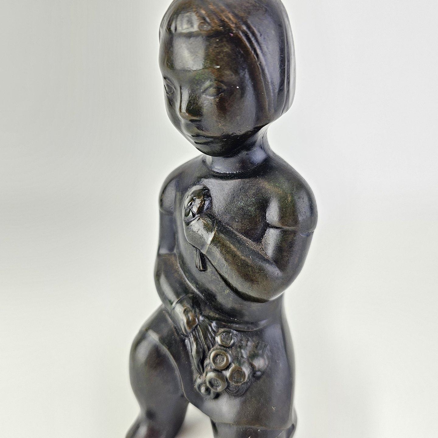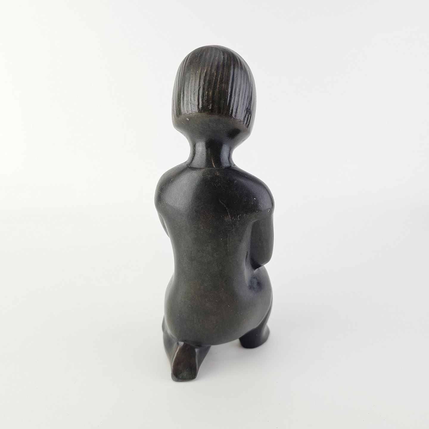 Beskrivelse: Grønlandsk figur med motiv af en knælende person med blomster Diskometal