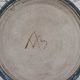 Rundt fad i riflet stentøj med blågrøn glasur. Signeret.
