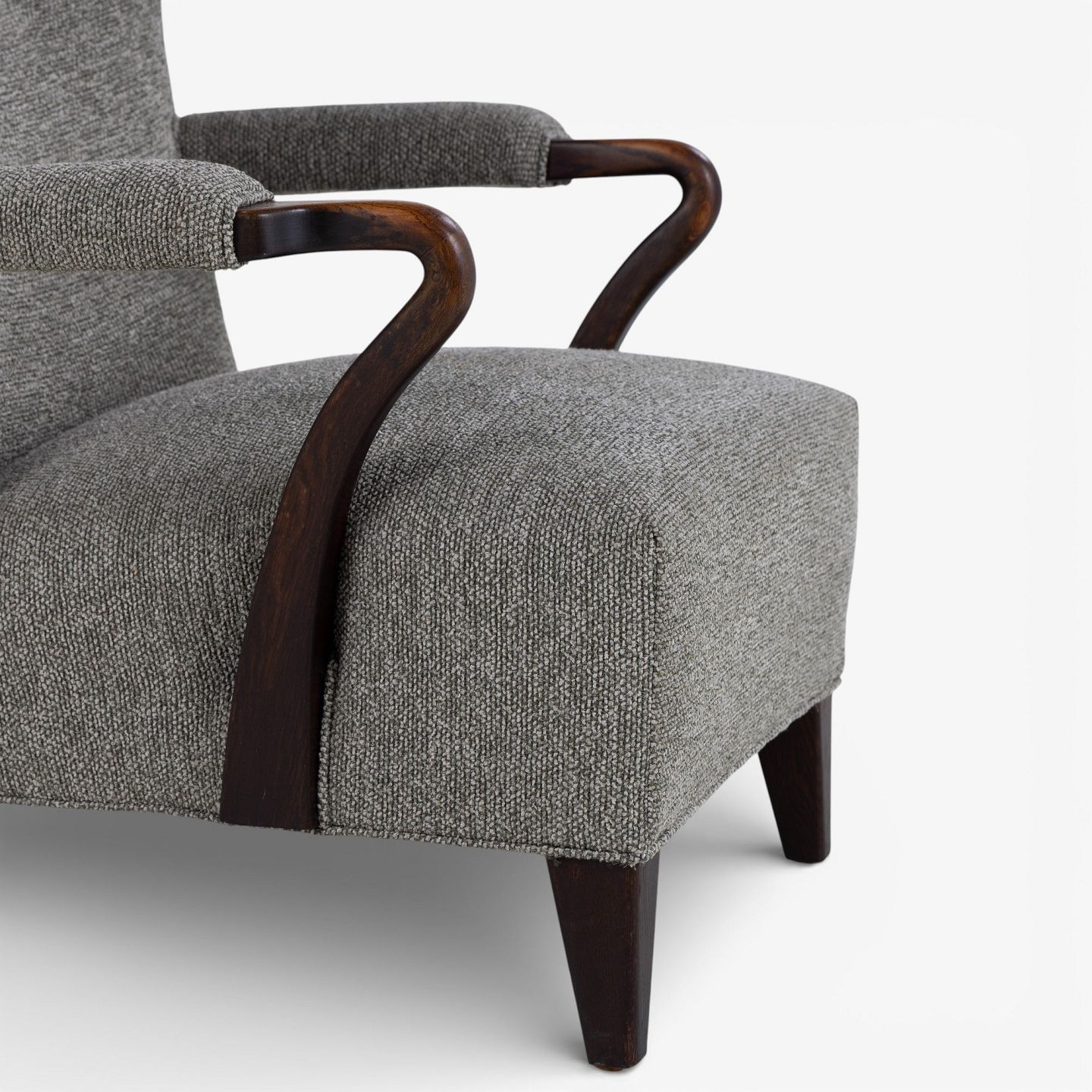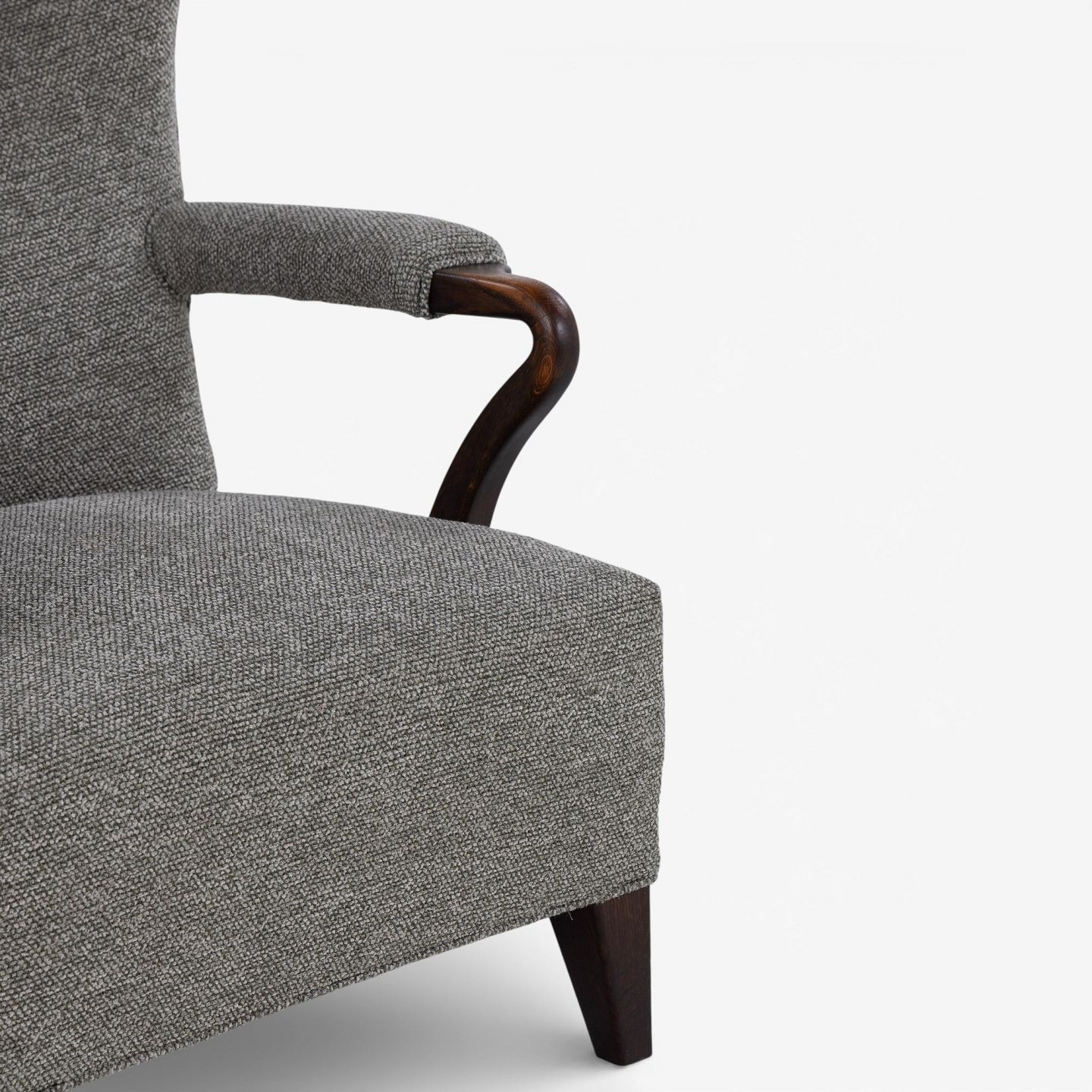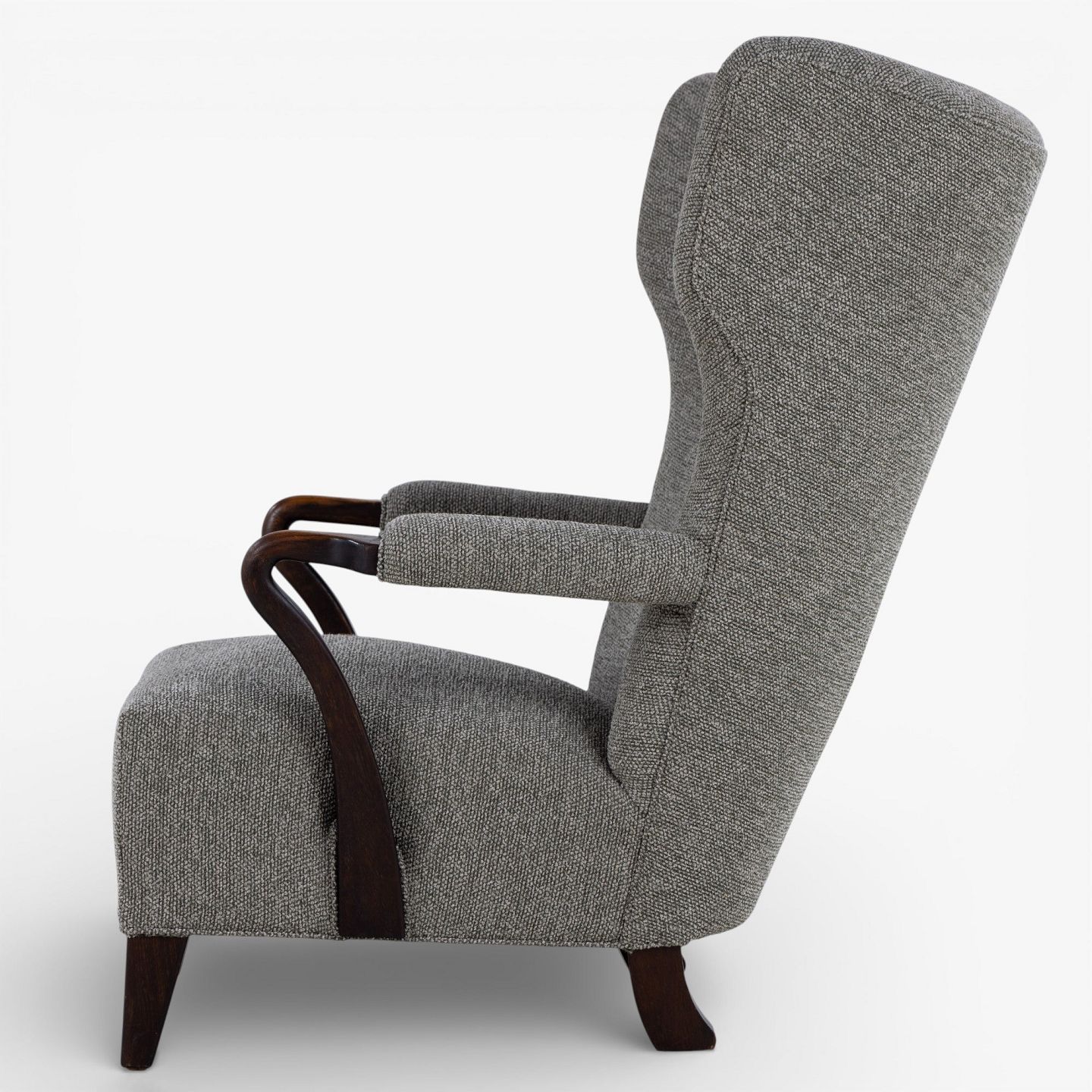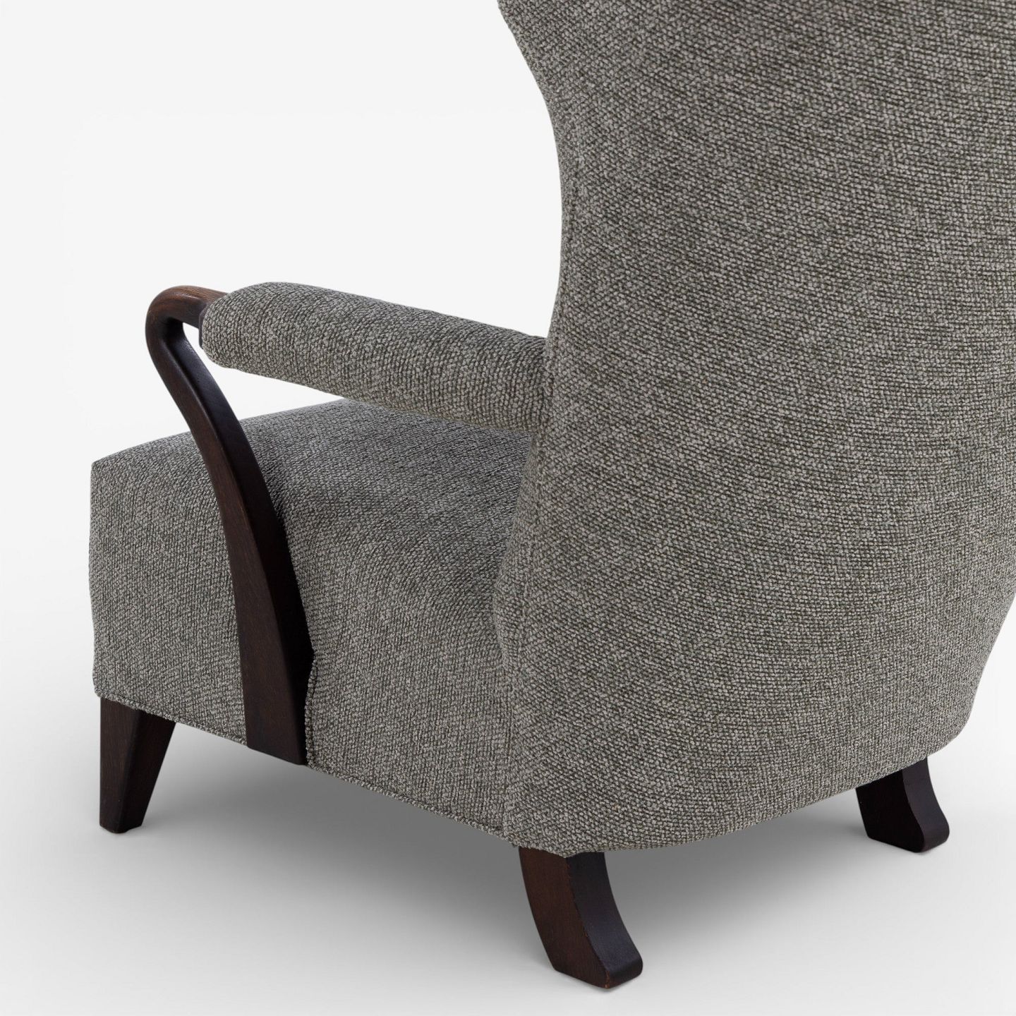 Højrygget lænestol betrukket med nyt 'Moss'-tekstil (farve: 0002) m. arme og ben i bejdset eg.