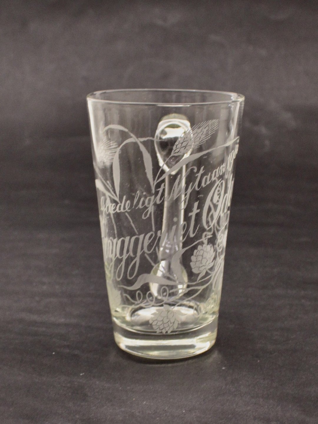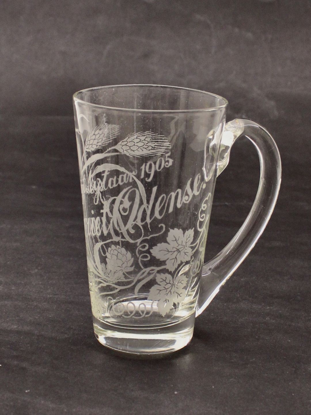 Beskrivelse: Øl krus med Hank H. 13,5 cm. Bryggeriet Odense Glædelig Nytår 1905 emne nr. 632408