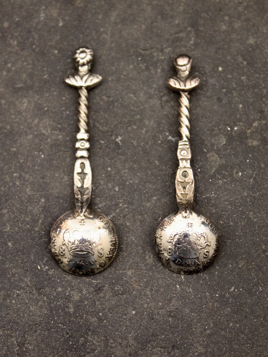 Beskrivelse: Et par sølv salt skeer L. 6,5 cm. af gamle danske sølv mønter emne nr. 632411