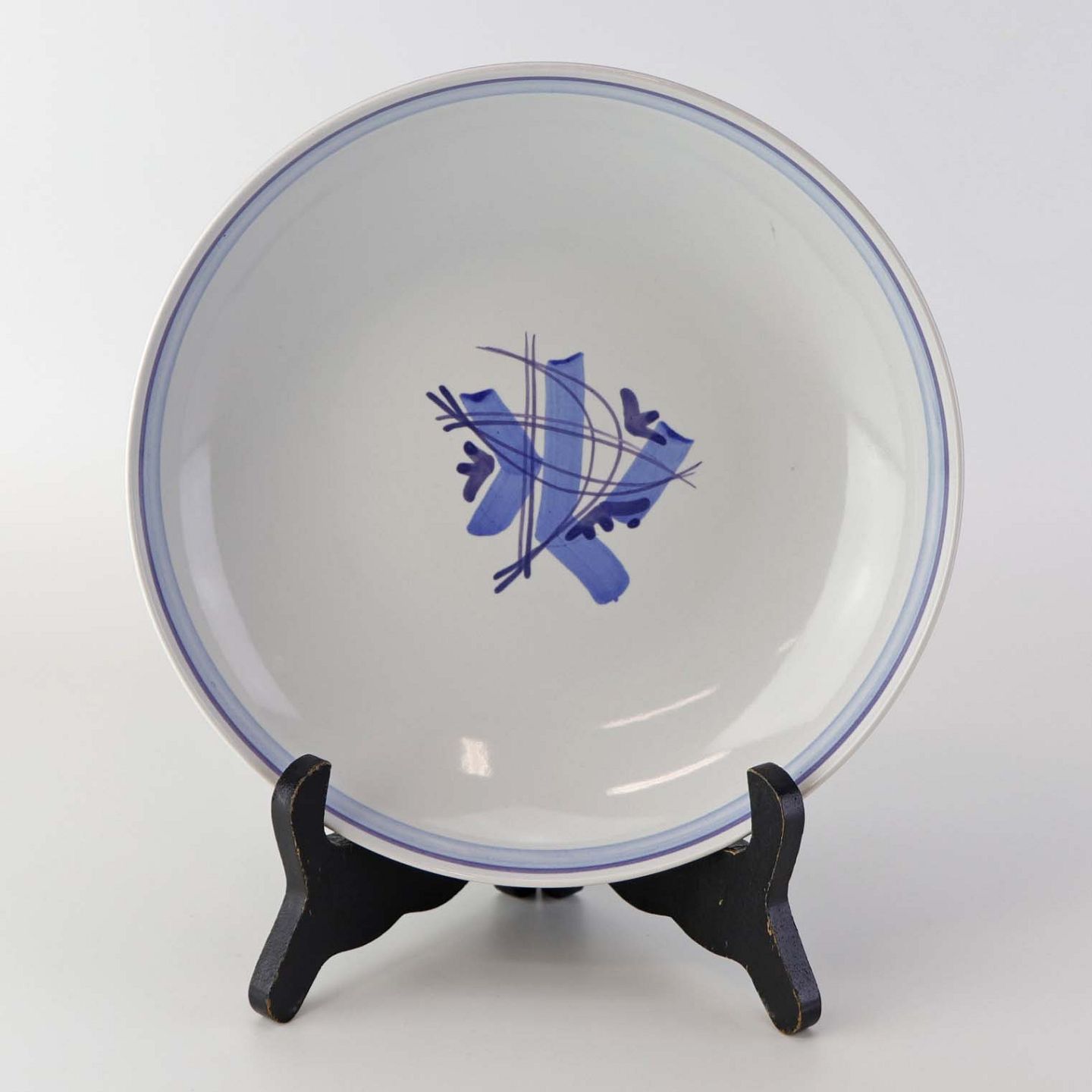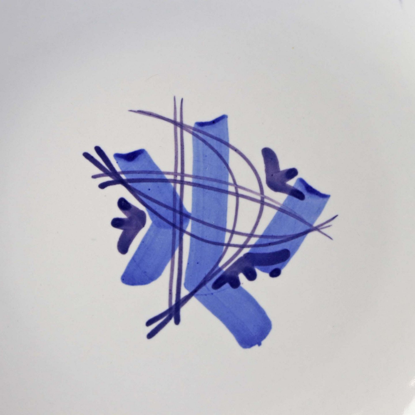 Fajancestel i stelform CA med dekoration af abstrakt motiv i blå og lyseblå på en råhvid baggrund.