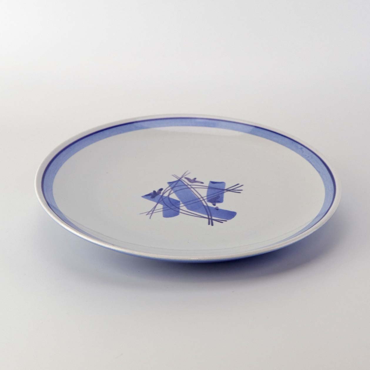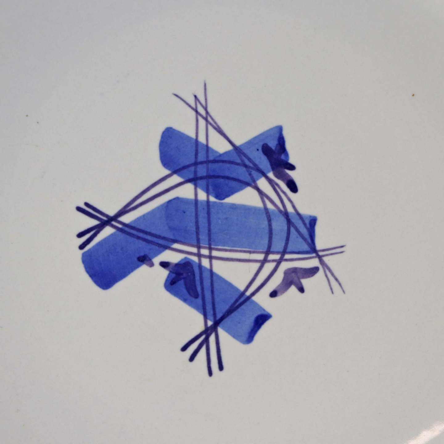 Fajancestel i stelform CA med dekoration af abstrakt motiv i blå og lyseblå på en råhvid baggrund.