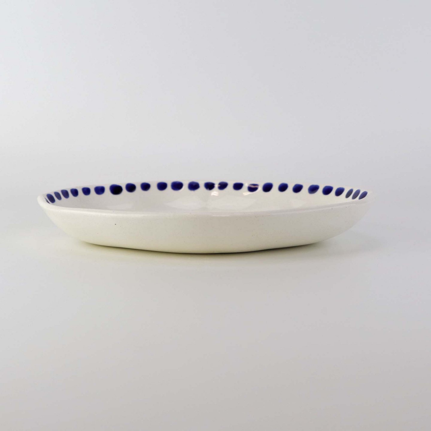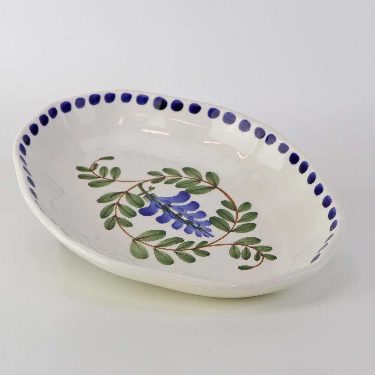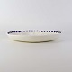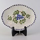 Beskrivelse: Lille ovalt fad med bølget form i fajance fra stellet Blåregn. Stellet er fremstillet i perioden år 1903-1933. Nr. 522/354
