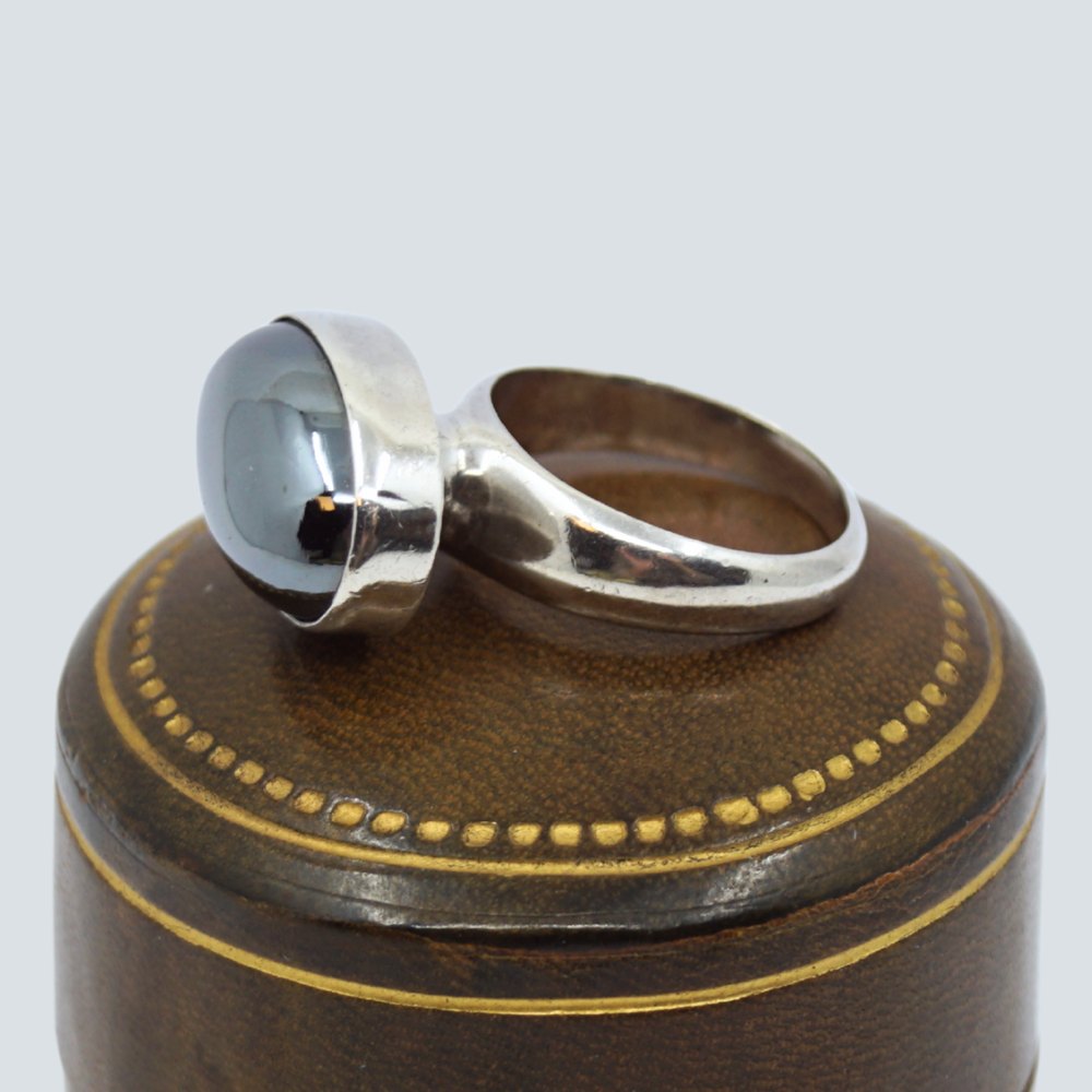 Beskrivelse: Nanna Ditzel for Georg Jensen; Ring i sterling sølv #123B, prydet med hæmatit. Ring str. 51.