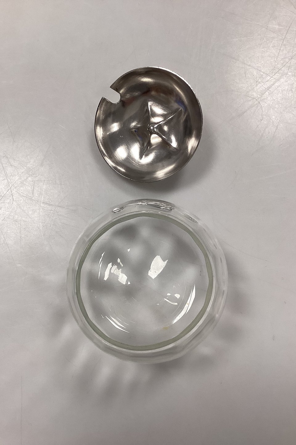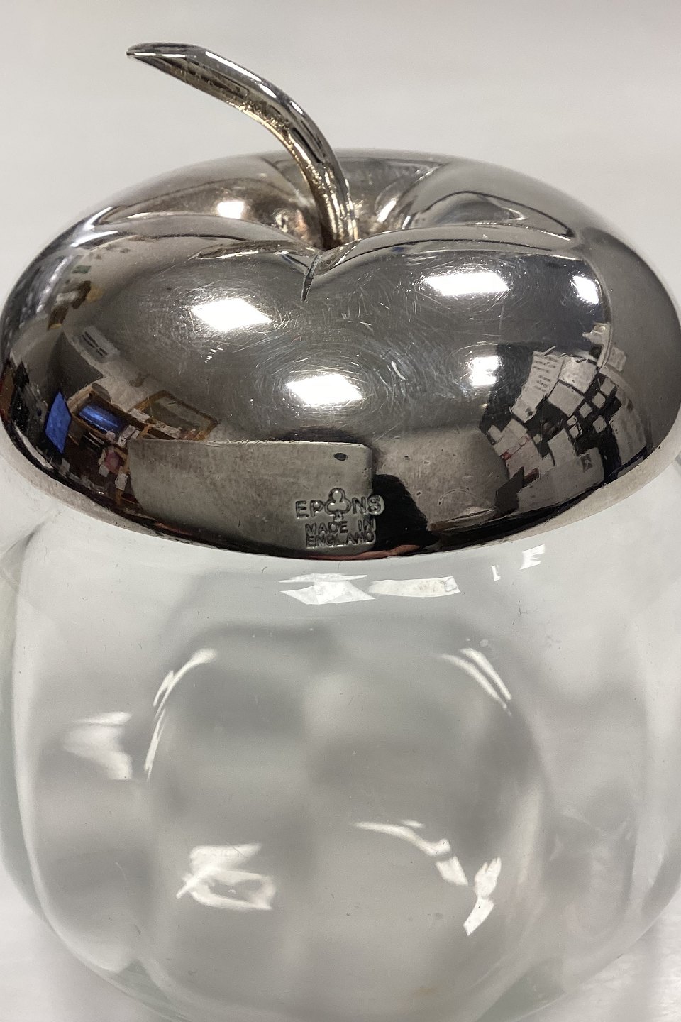 Beskrivelse: Engelsk Sølvplet/EPNS Marmeladekrukke. Glasset har optiske riller, og låget er formet som toppen af et æble.