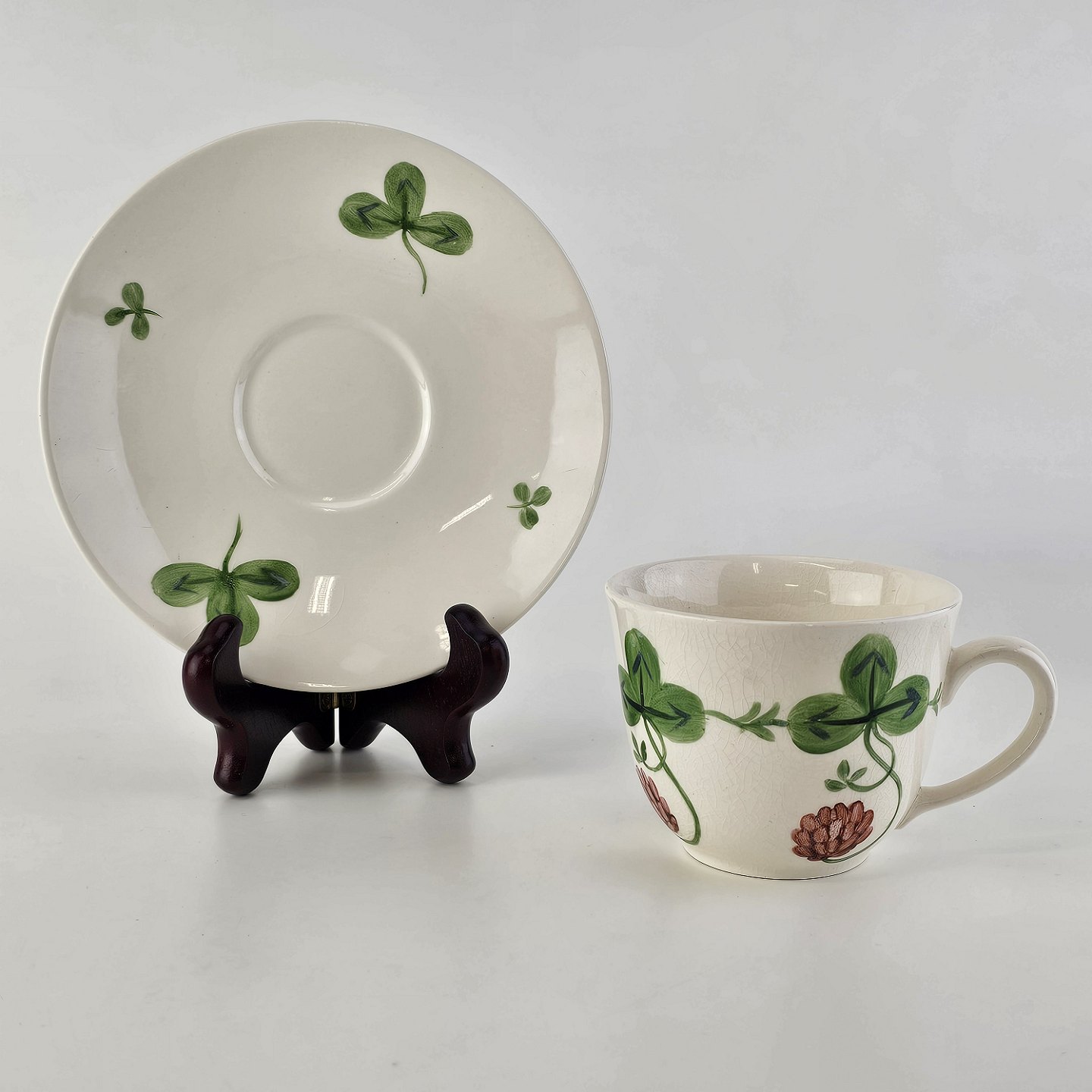 Kløver er fajancestel med motiv af rødkløver på lys baggrund.