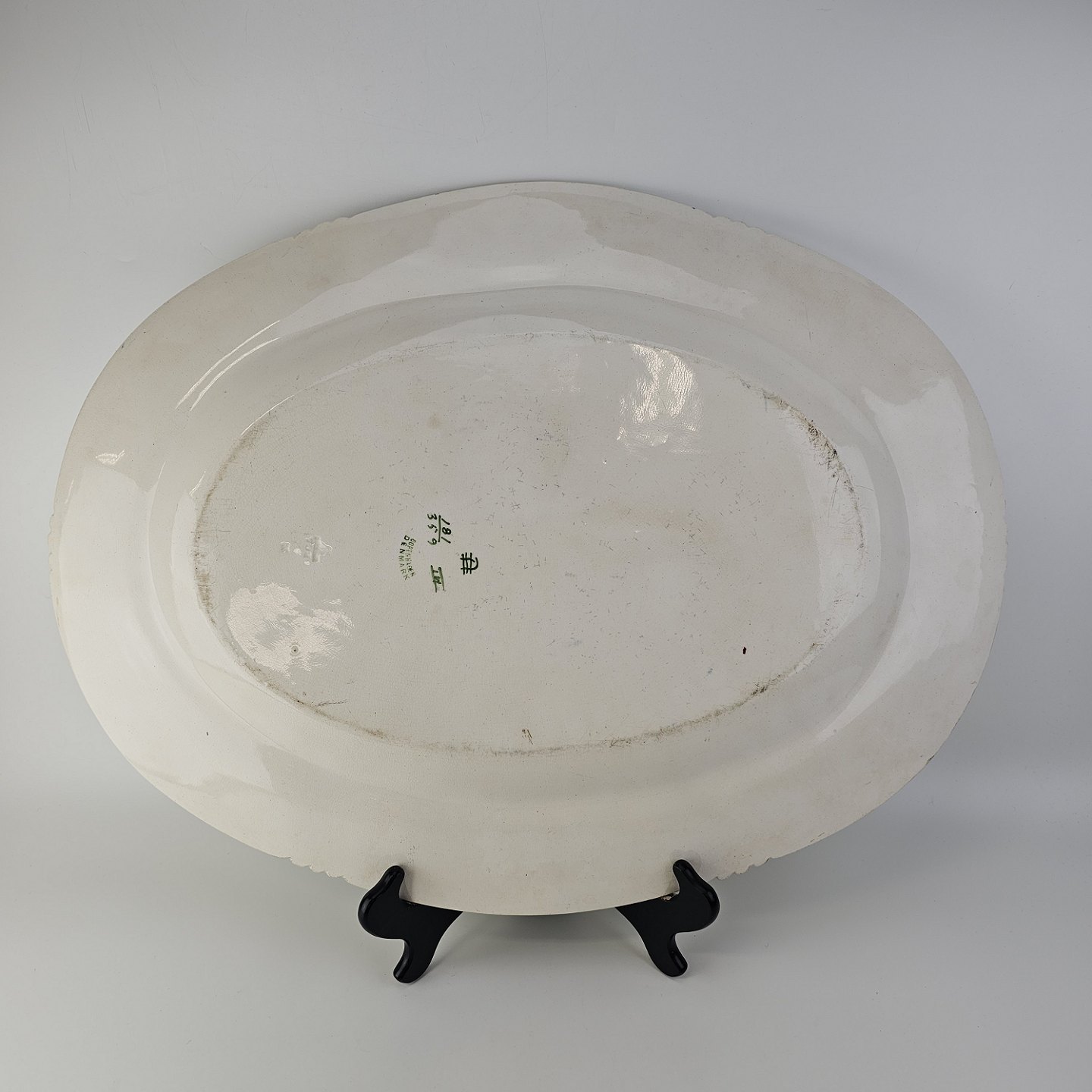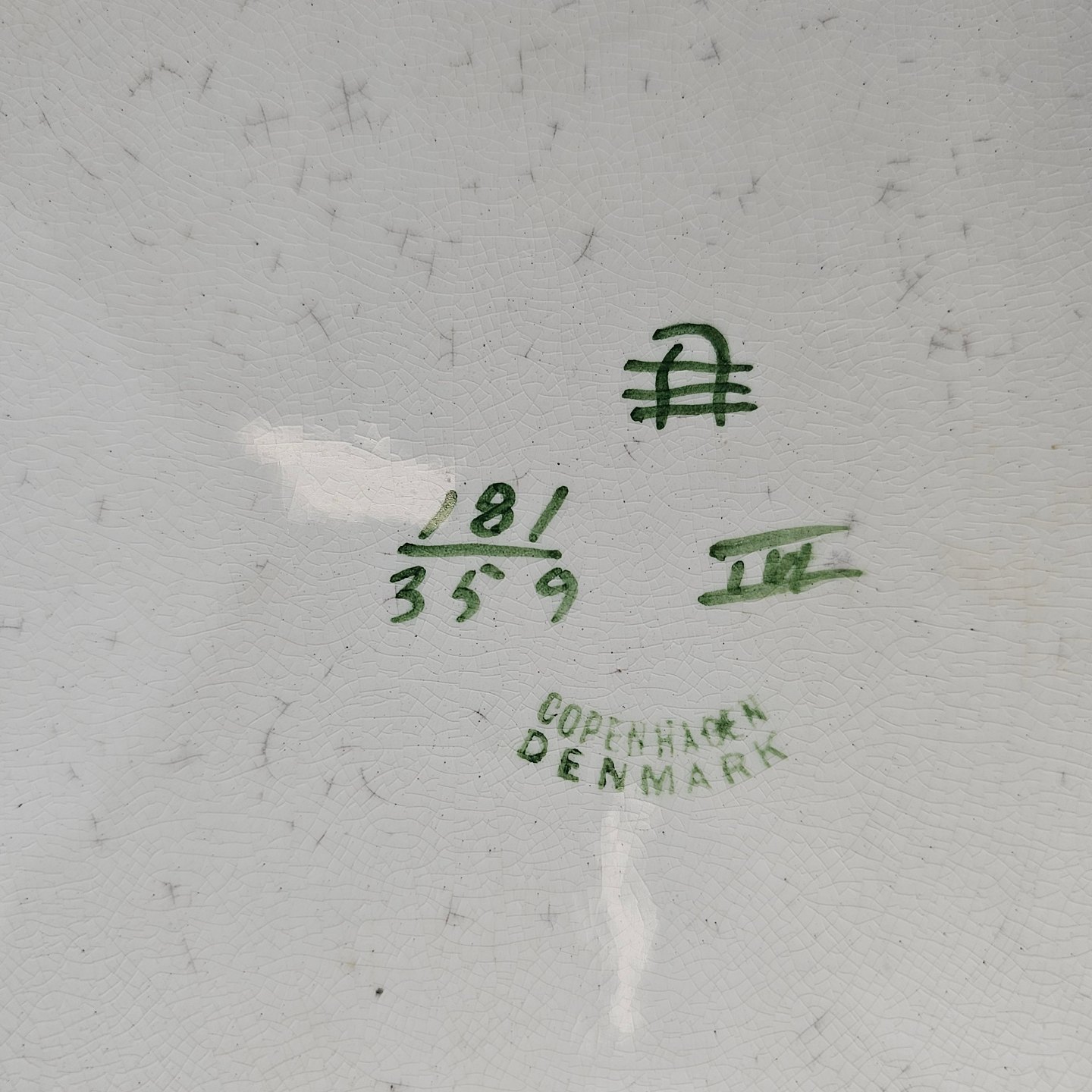 Beskrivelse: Ovalt fad i kunstfajance fra stellet Kløver. Nr. 181/359