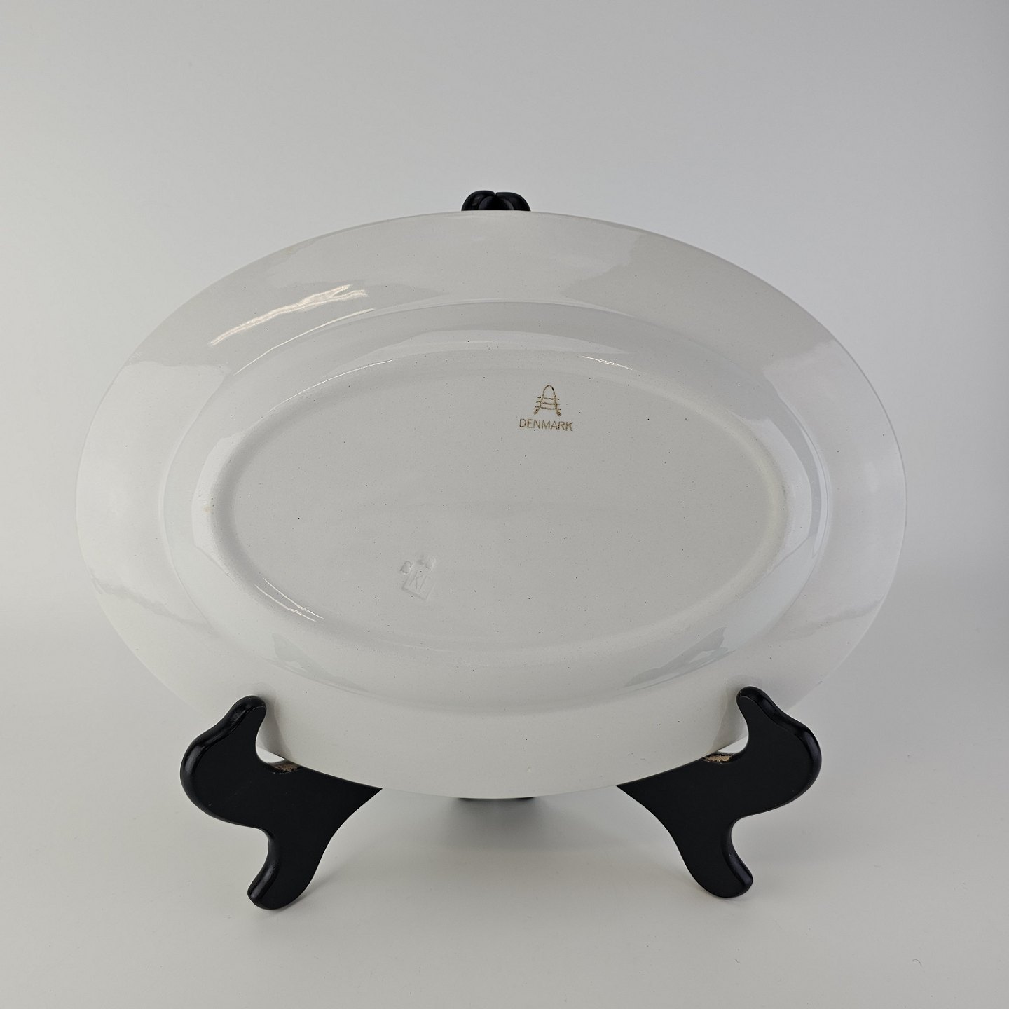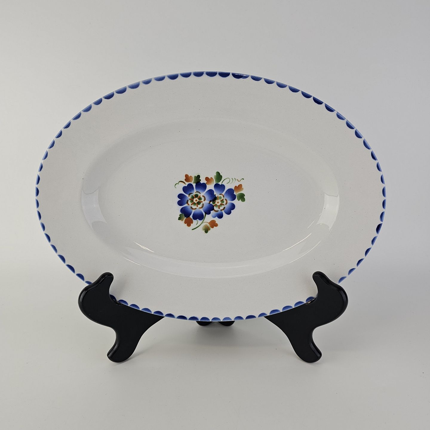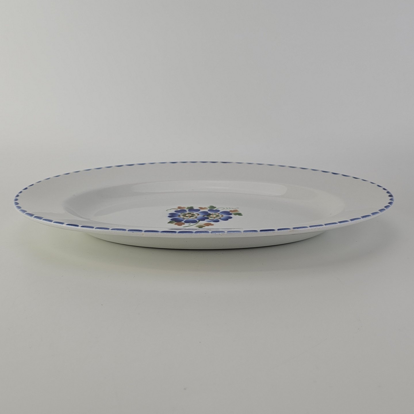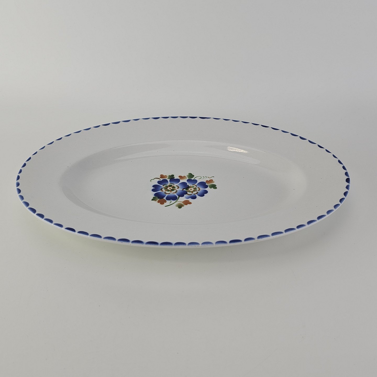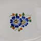 Beskrivelse: Ovalt fad i fajance fra stellet Geranium II fremstillet i perioden 1927-1940.