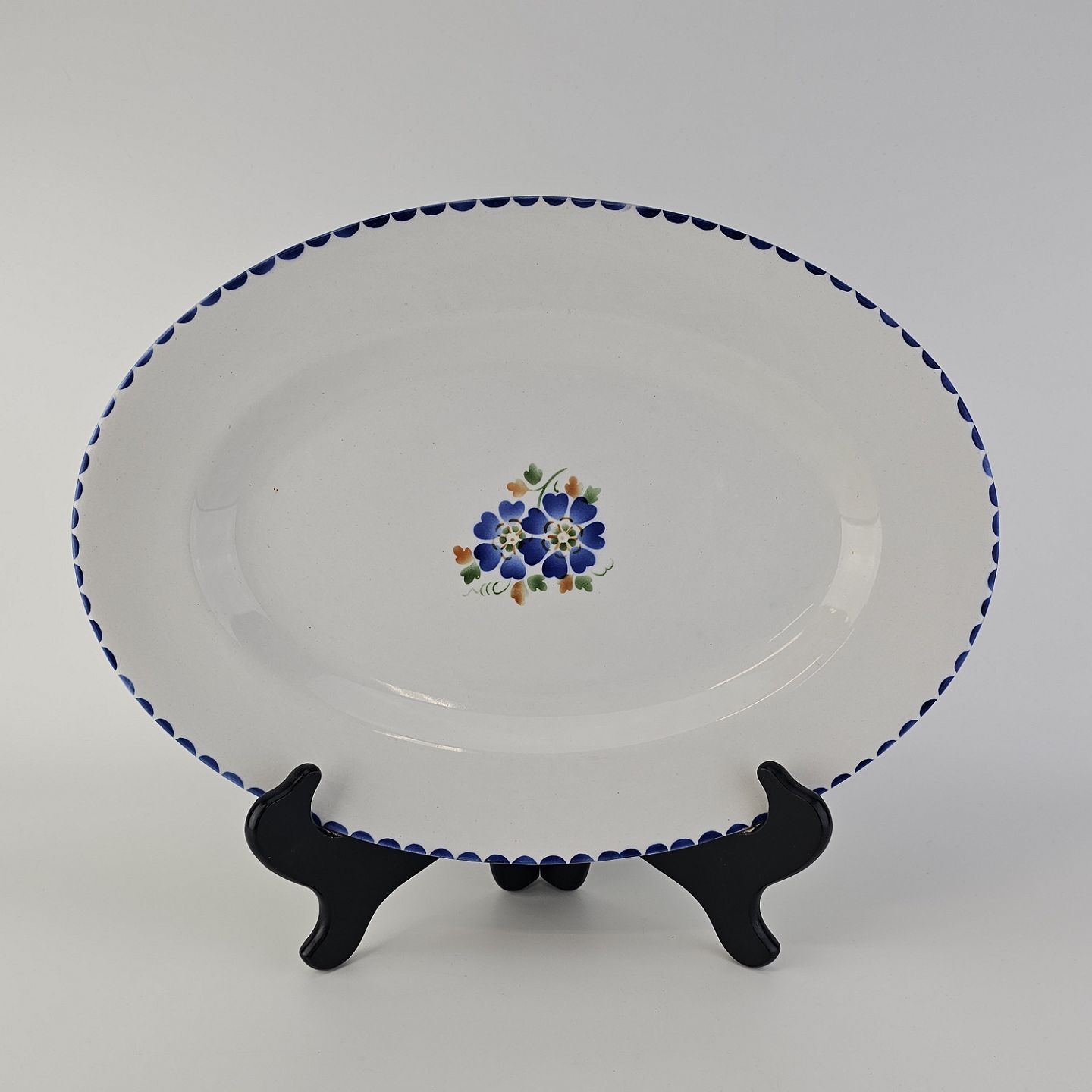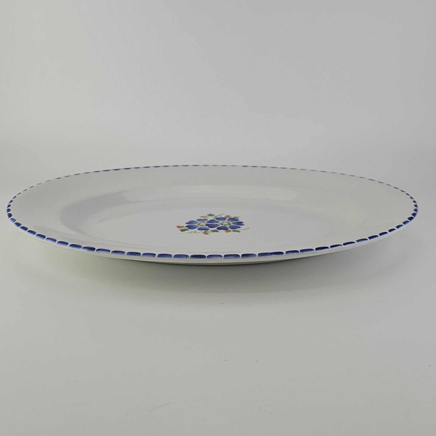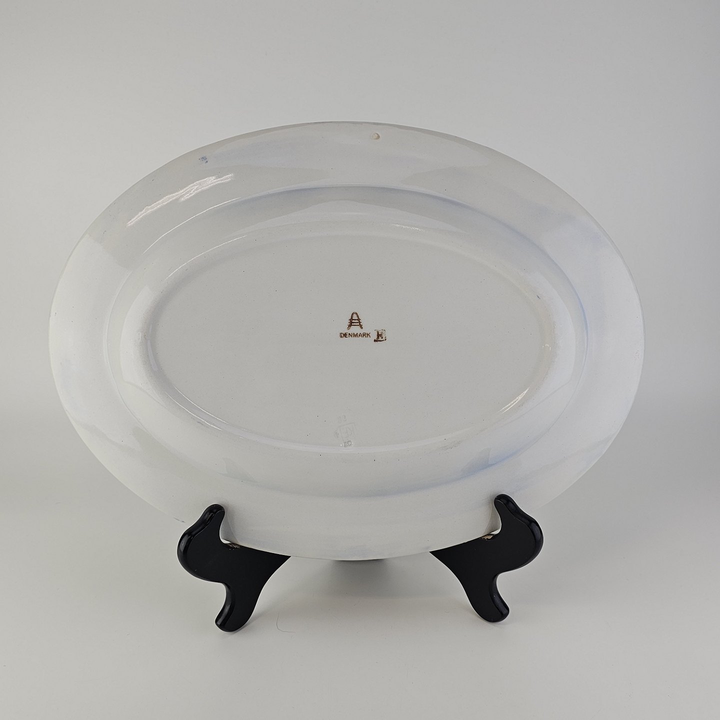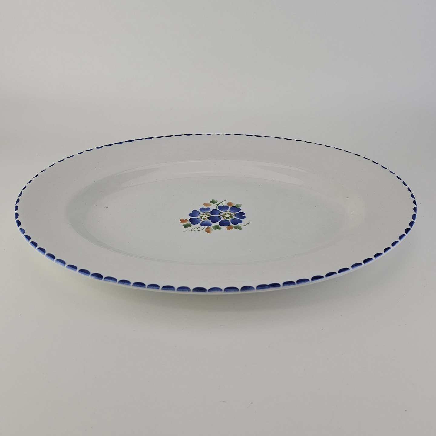 Beskrivelse: Ovalt fad i fajance fra stellet Geranium II fremstillet i perioden 1927-1940.