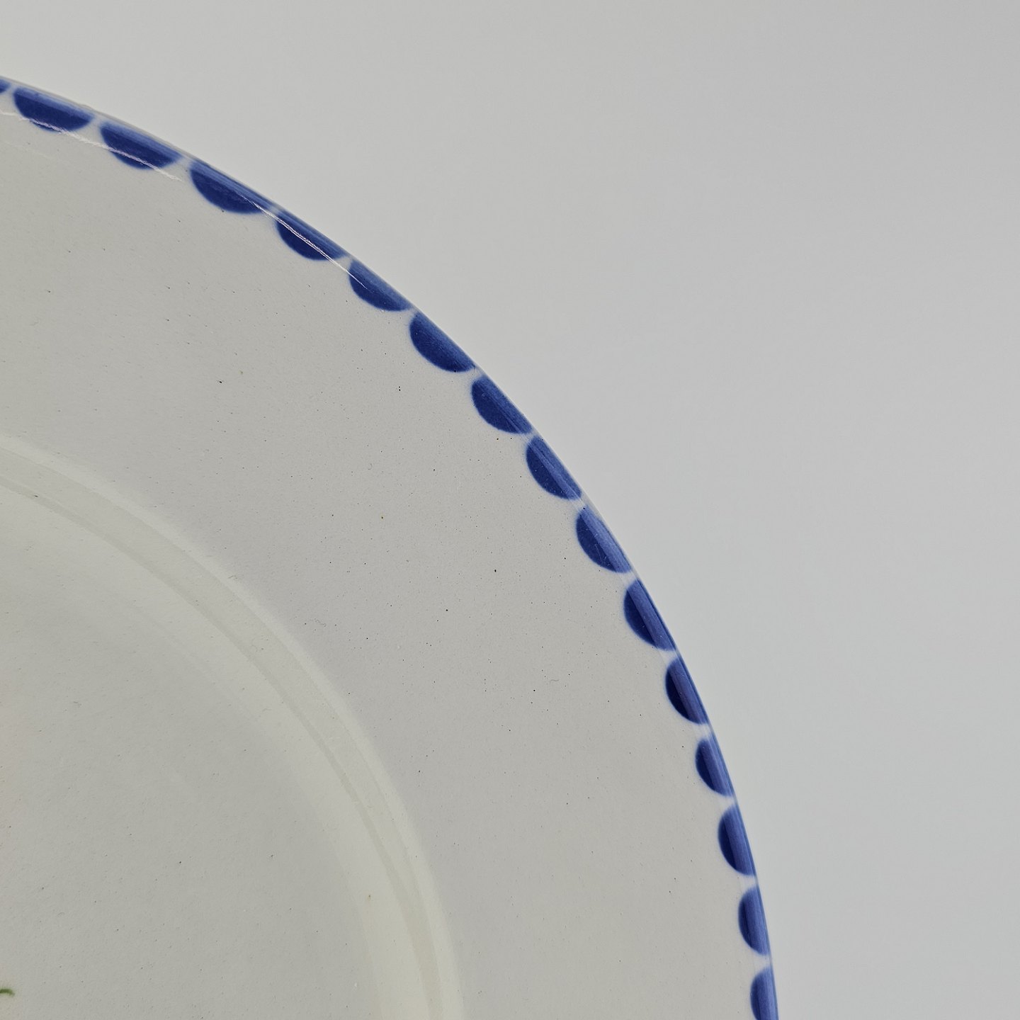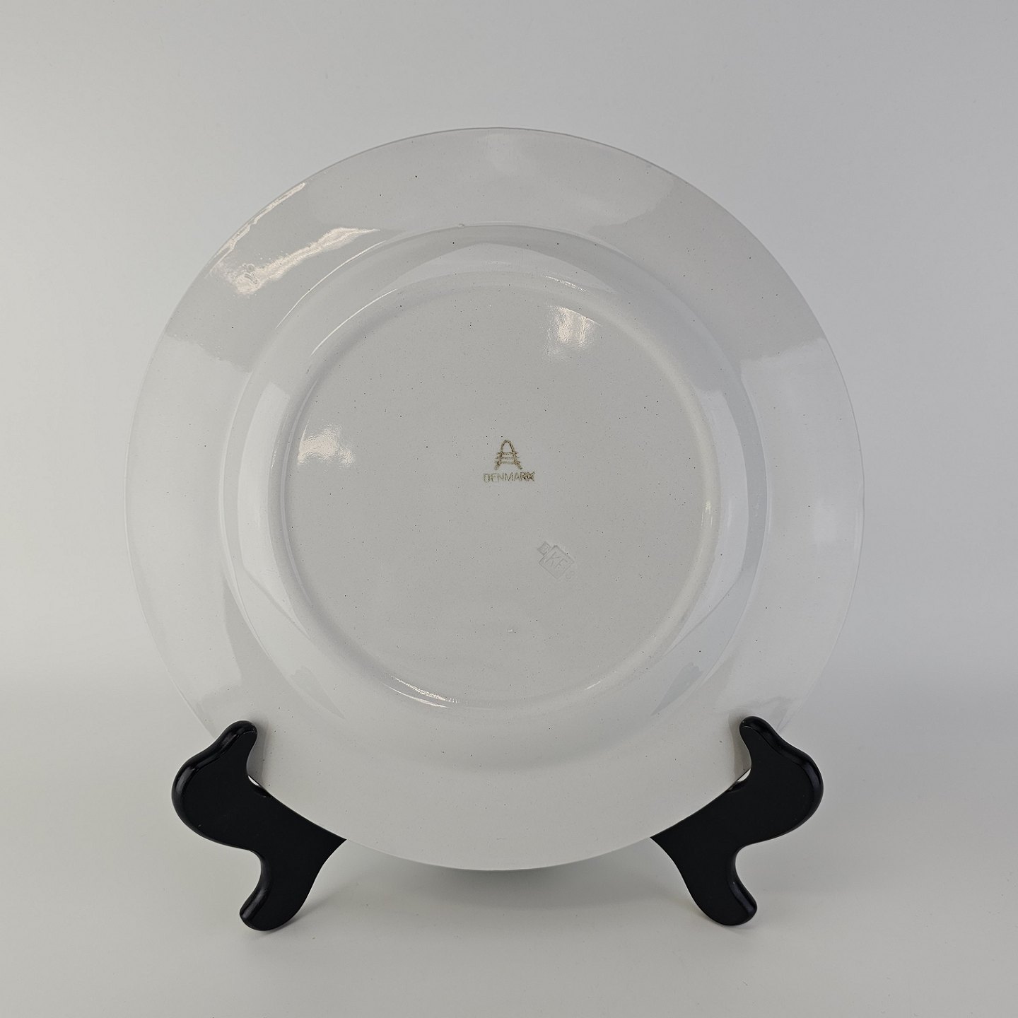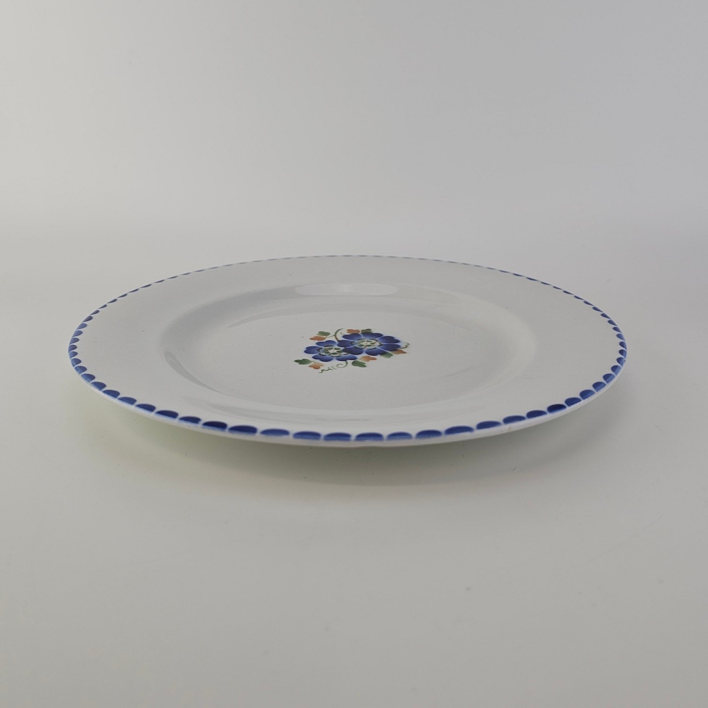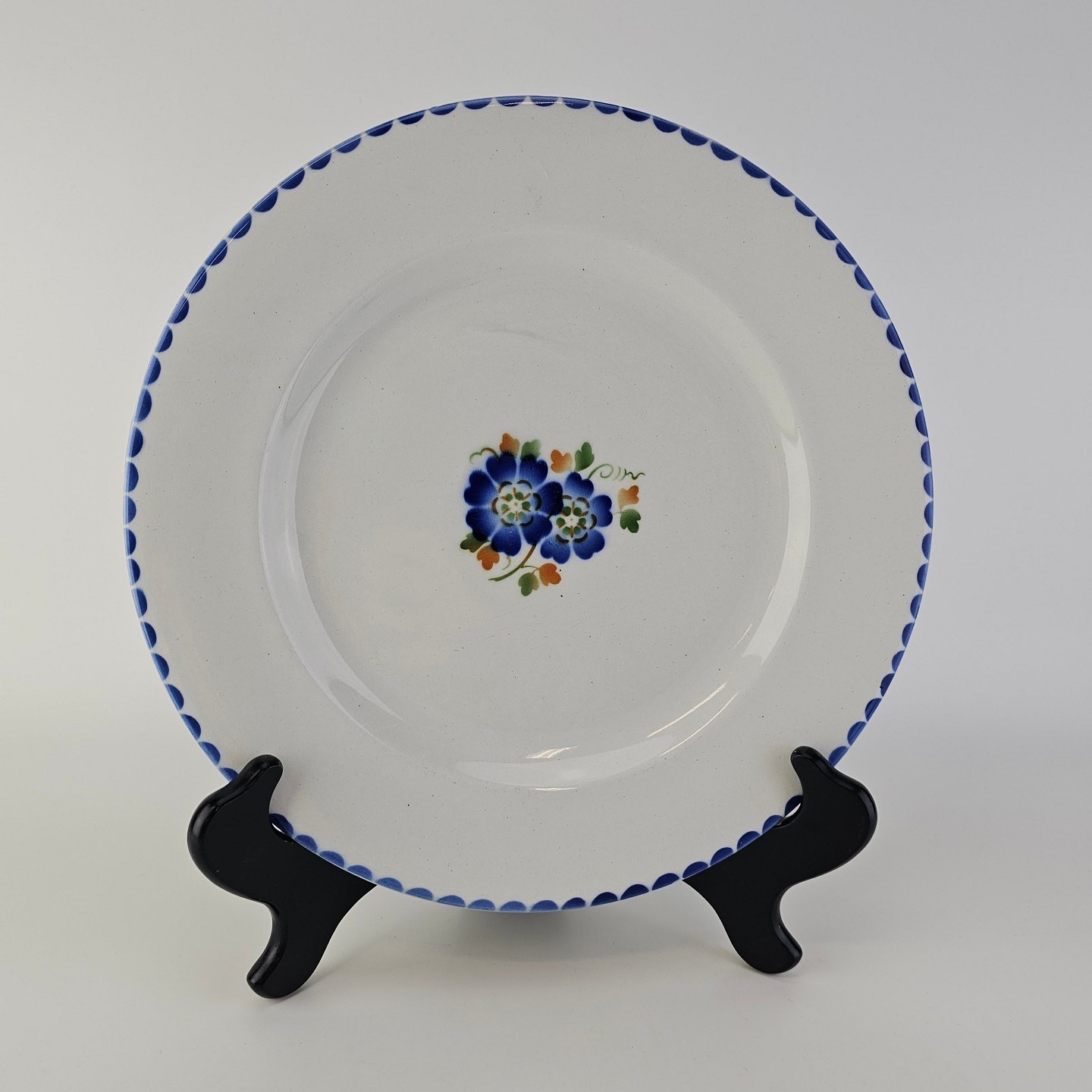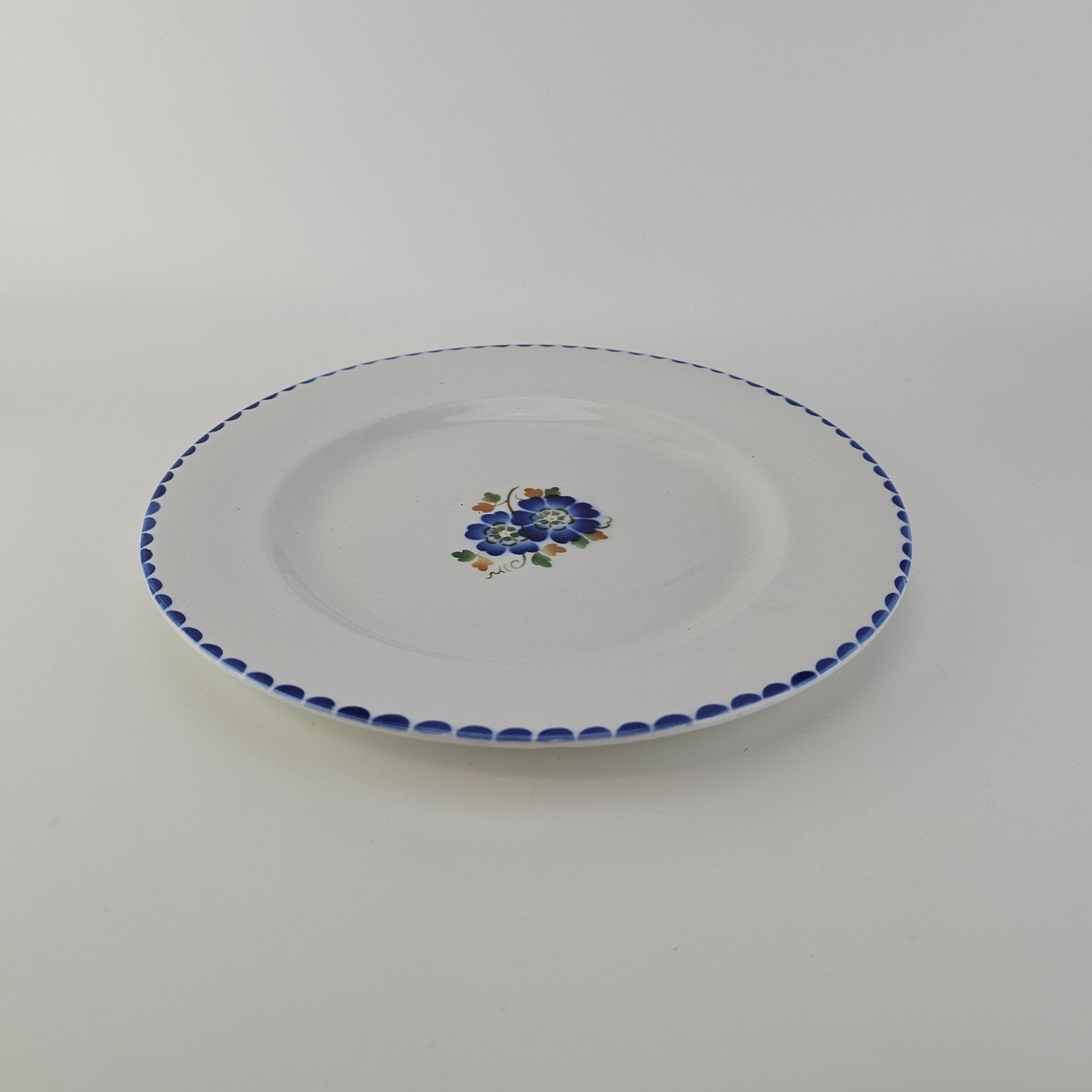 Beskrivelse: Flad middagstallerken i fajance fra stellet Geranium II fremstillet i perioden 1927-1940.