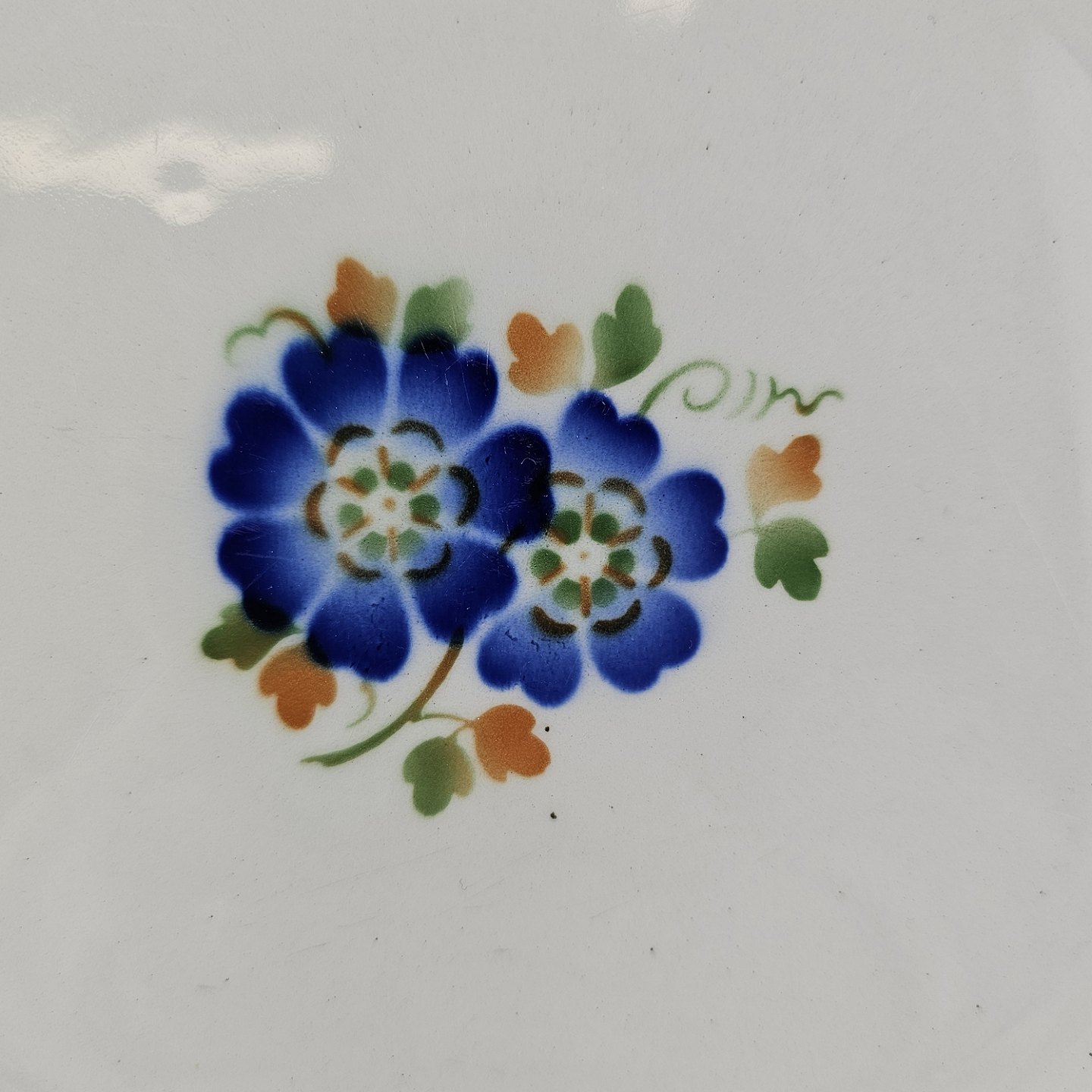 Hvidt fajancestel i stelform Sterling med motiv af blå blomster og blå prikker på kanten.