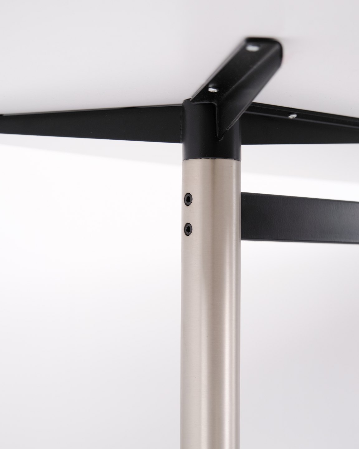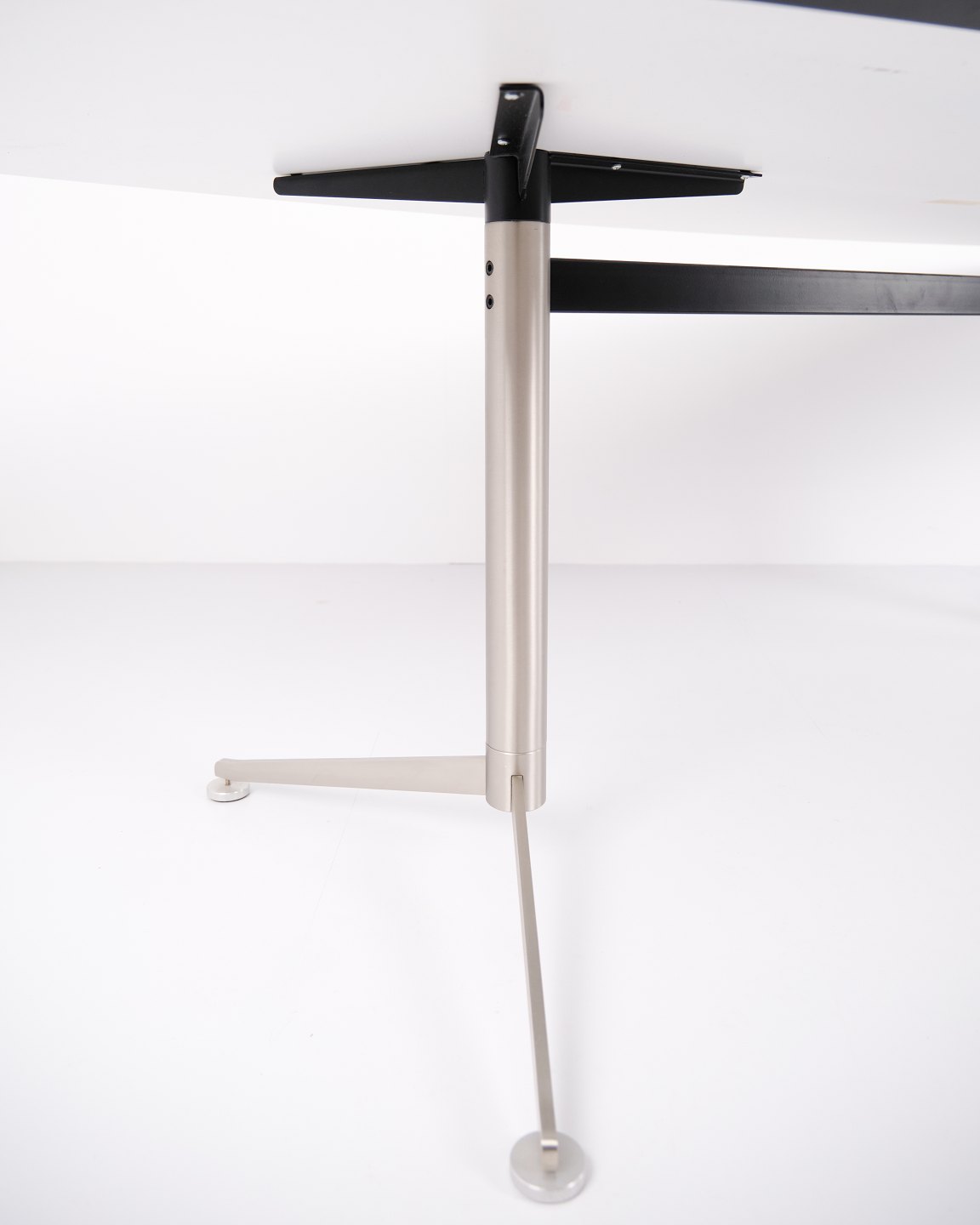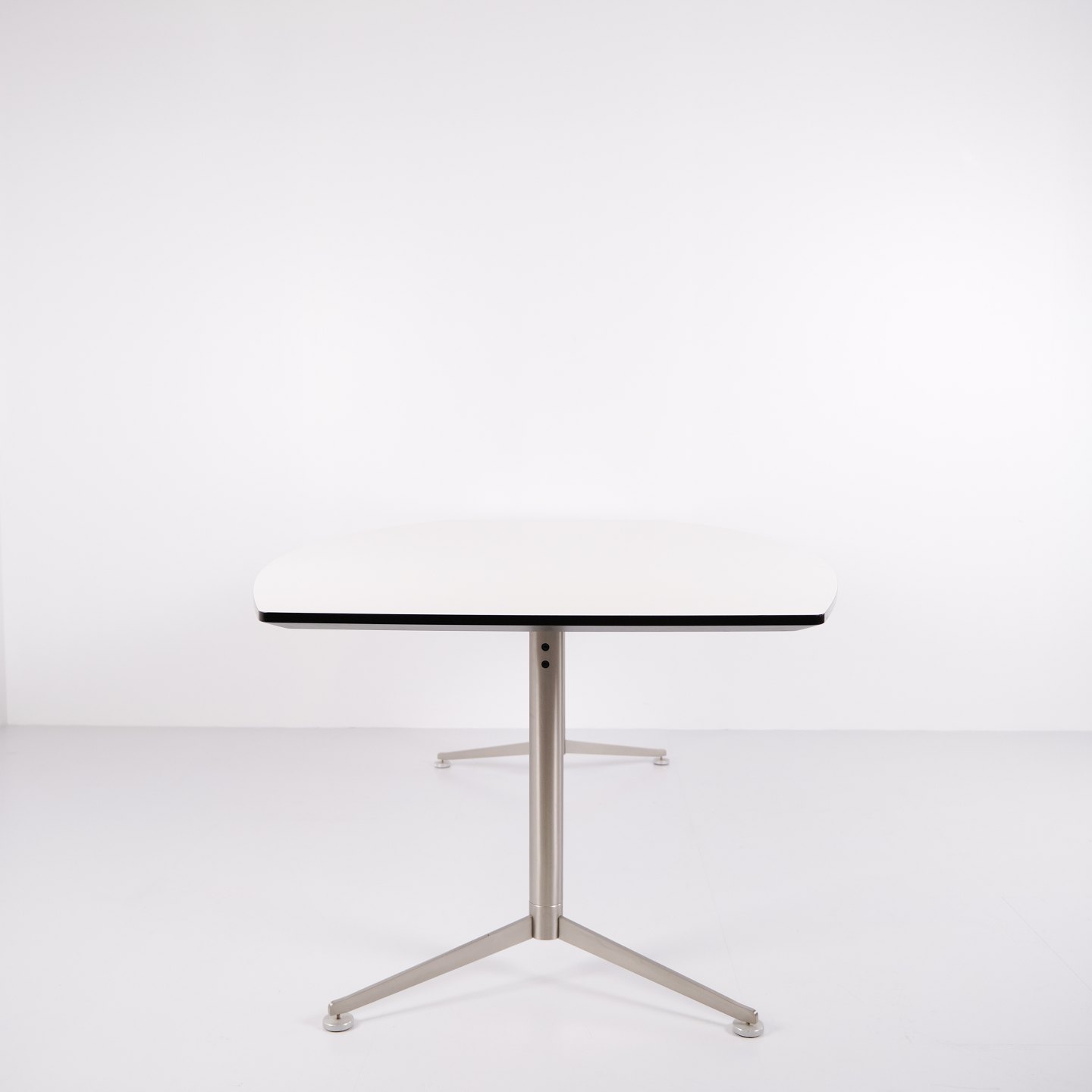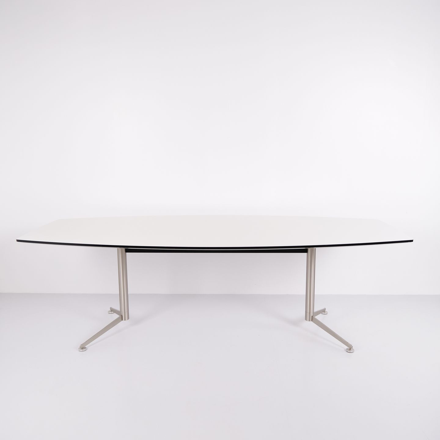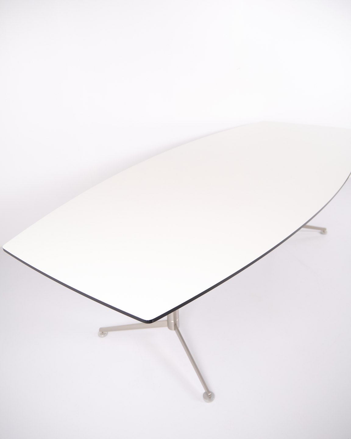 Beskrivelse: Paustian konferencebord model SP64 Spinal i hvid laminat med stel i børstet stål. Dansk design med funktionelt og moderne udtryk.