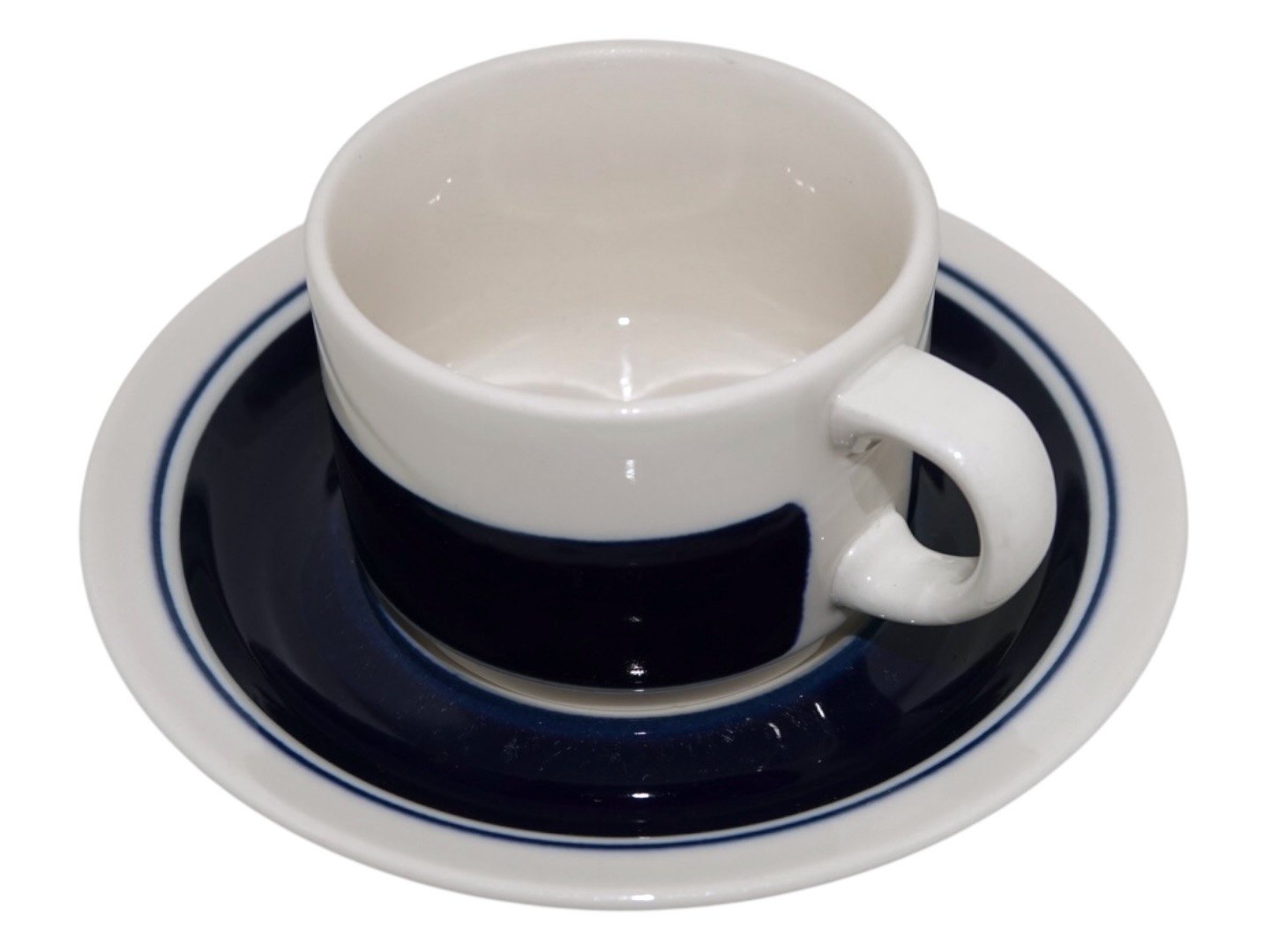 Beskrivelse: Arabia Finland Kasino, mørkeblå kaffekop med underkop.