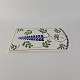 Fajancestel med dekoration af ranker af blåregn og blade på lys baggrund afsluttet med kant af runde blå pletter.
