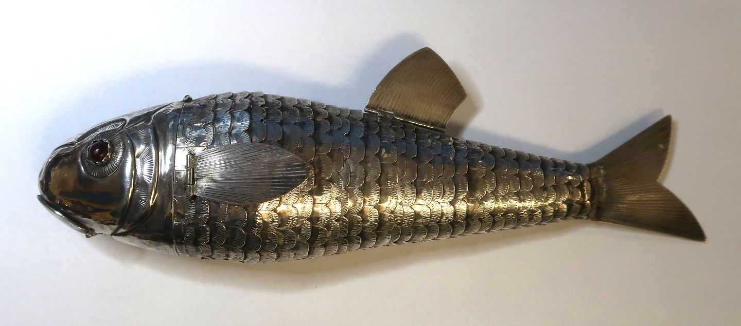 Beskrivelse: Sølv hovedvandsæg i form af stor fisk med røde sten (830). Længde 17 cm