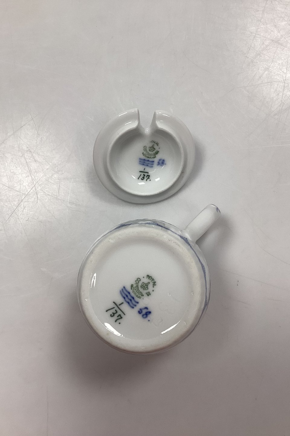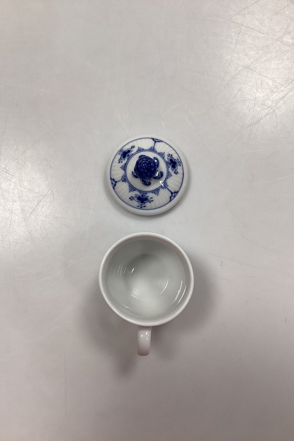 Beskrivelse: Royal Copenhagen Musselmalet Riflet Sennepskrukke med låg No. 137
