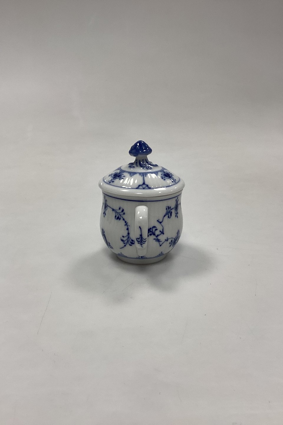 Beskrivelse: Royal Copenhagen Musselmalet Riflet Crémekop No. 64 med låg No. 64A.