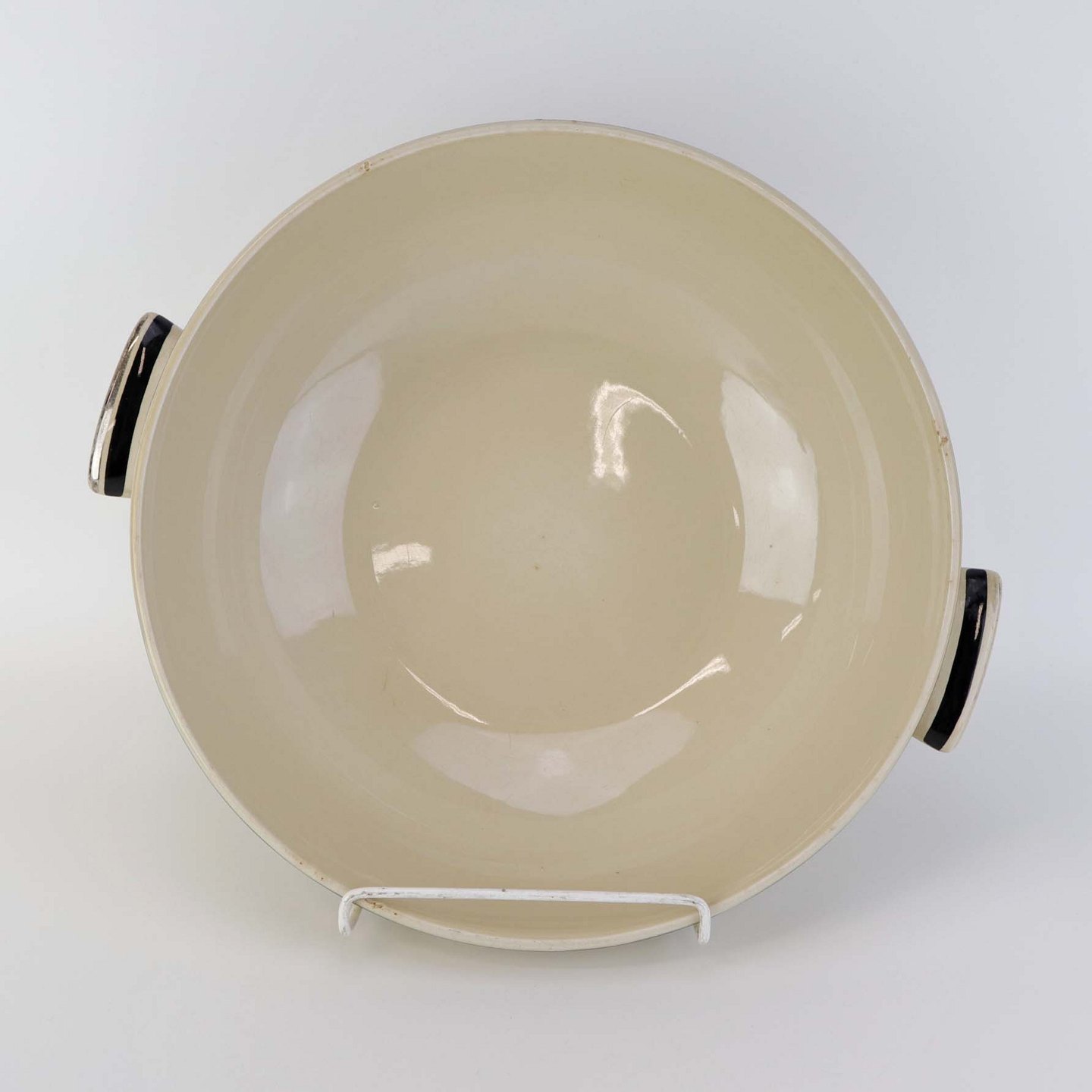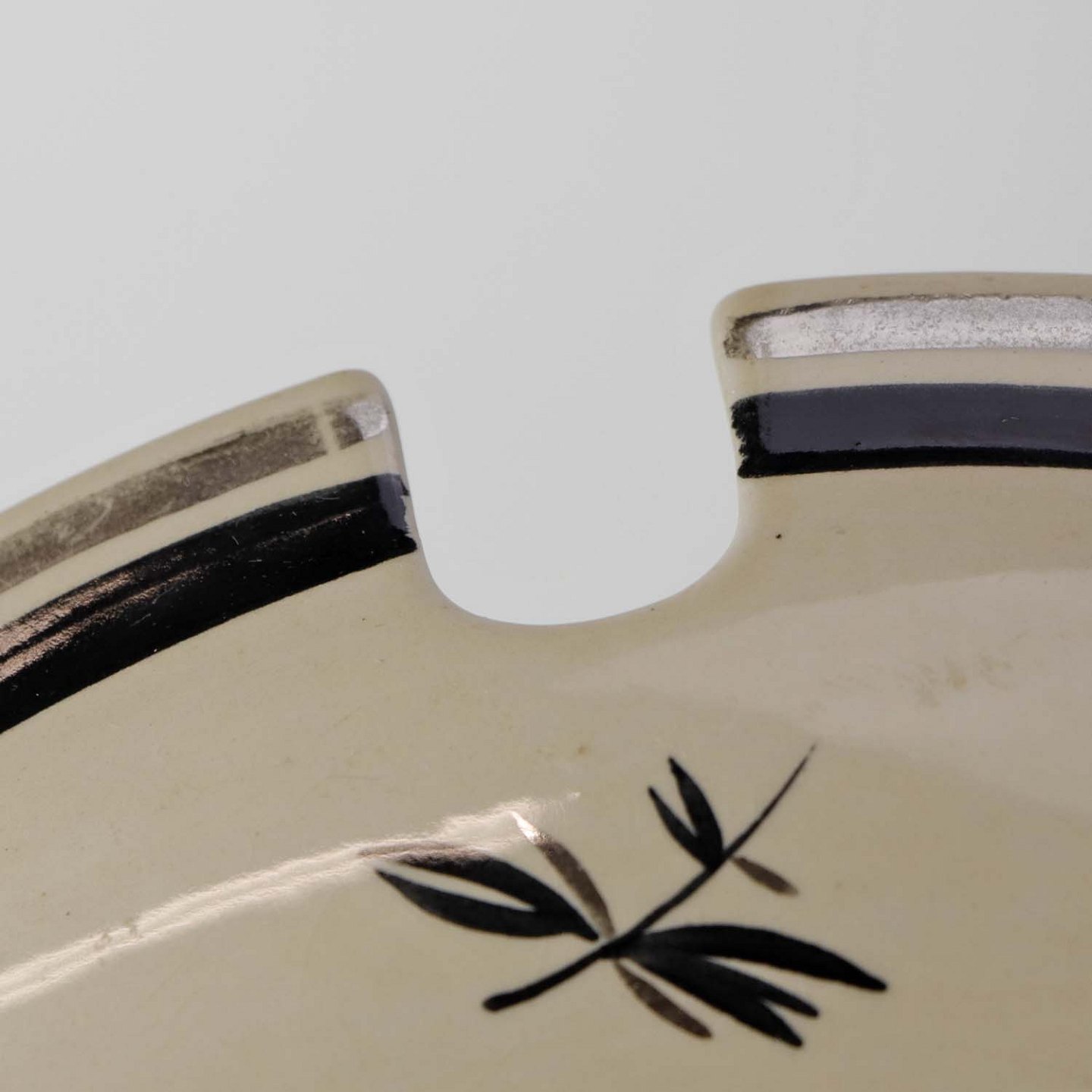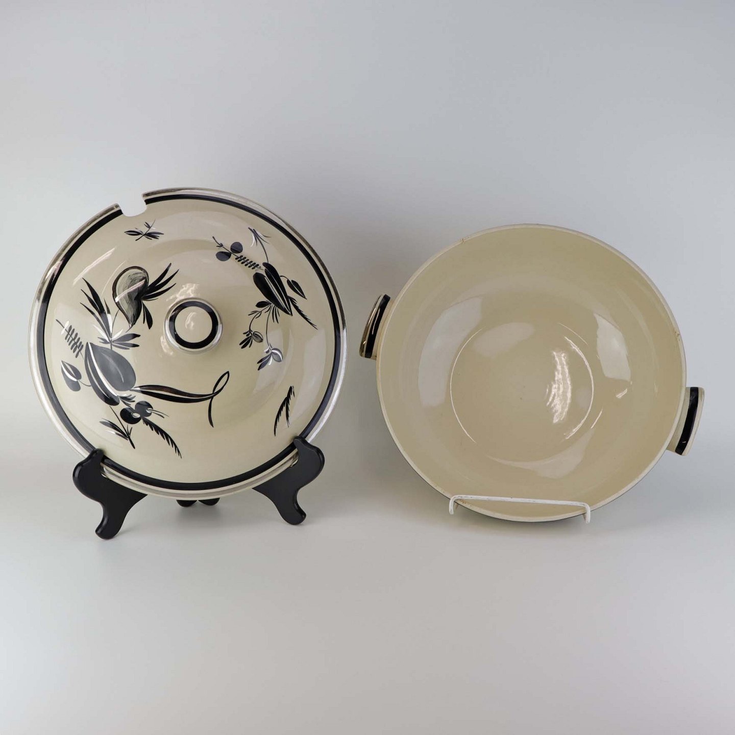Råhvidt fajancestel i stelform E med dekoration af naturmotiver i sølv og sort farve.
